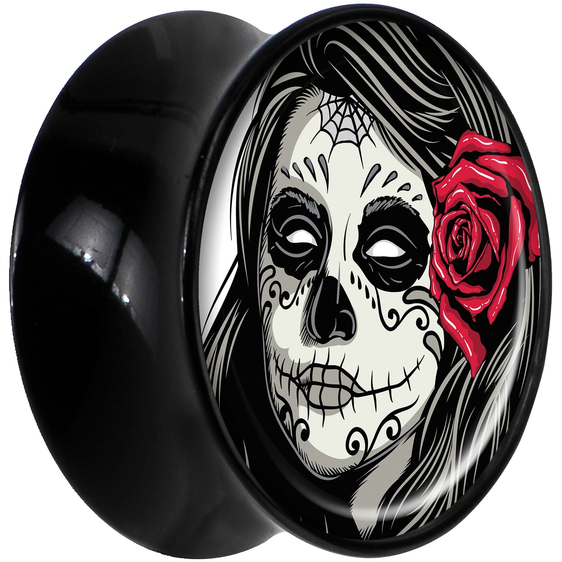 Hypoallergenic jewelry for sensitive skin.Black Acrylic Katrina Sugar Skull with Rose Saddle Plug Set 5/8"