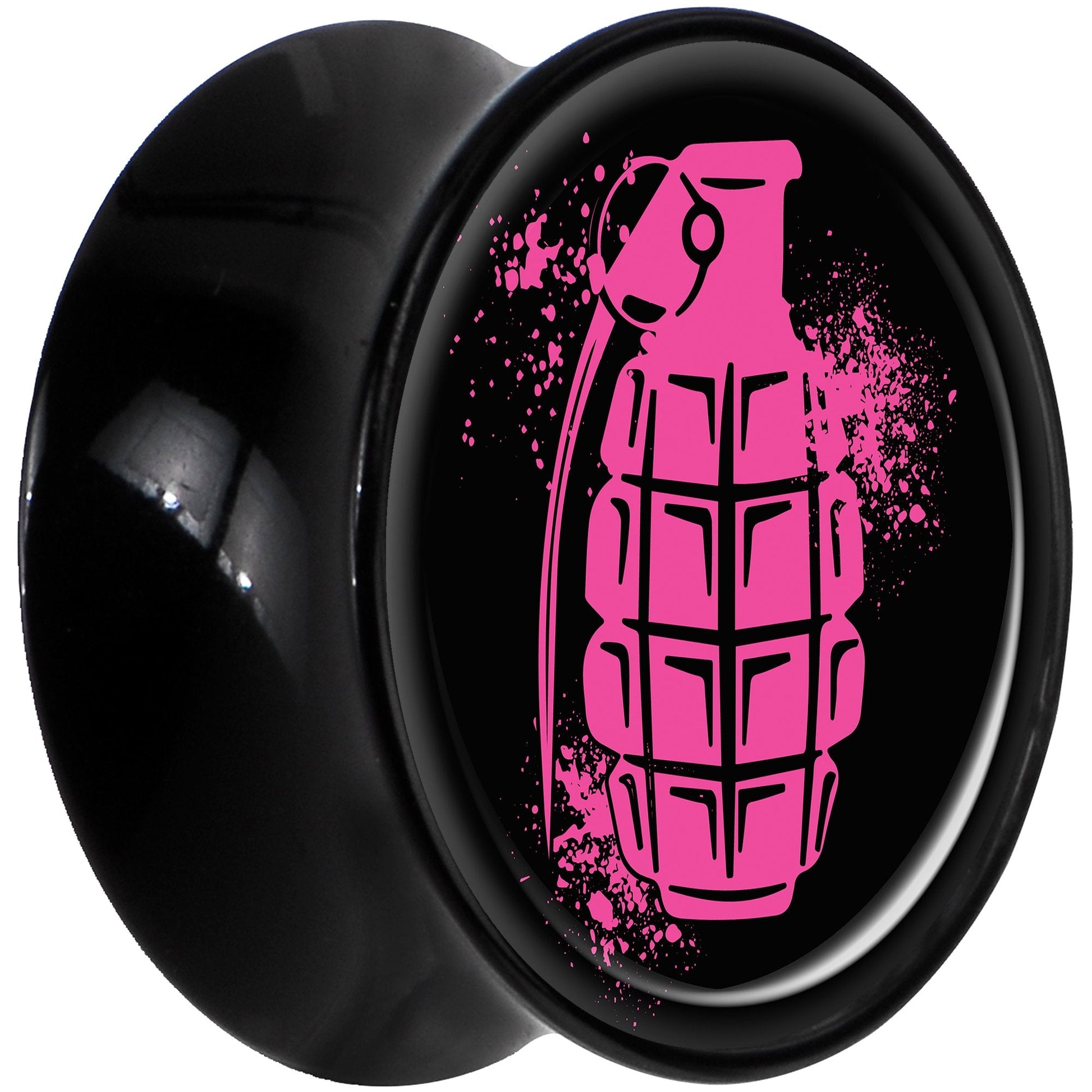 If you love the color pink and pop culture images like grenades then this pair of plugs is right for you! Made with lightweight black acrylic, these 16mm ear gauges are made with a saddle style design for comfortable wear and are sold as a set of two for you.
