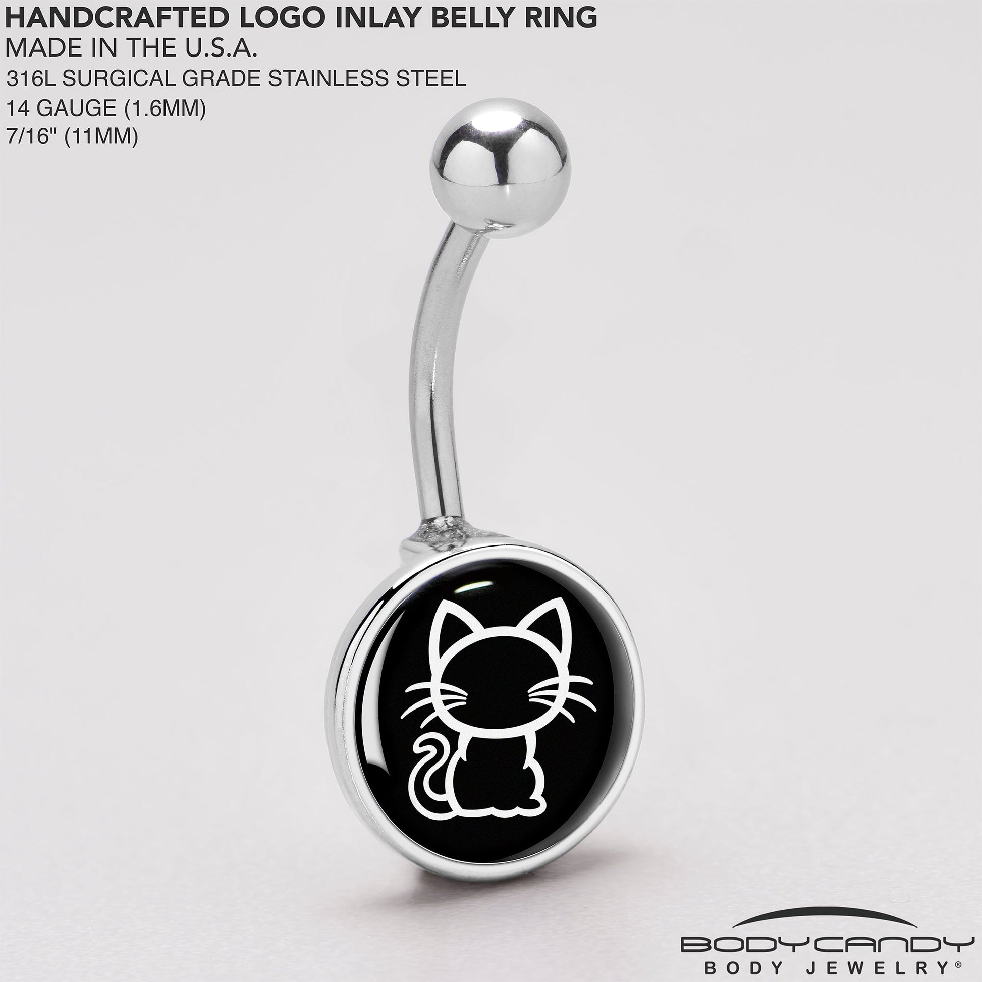 Keep it simple while keeping it as adorable as the kitty cat on this 14 gauge navel ring. It's made with a 7/16 inch 316L surgical grade stainless steel curved barbell with a 5mm top ball end. The bottom end features a cat charm. The cat is styled with the simplest of detailing in white against a black background for visual impact. You'll be ready to purr like a pussycat with this fabulous feline belly piercing jewelry.
