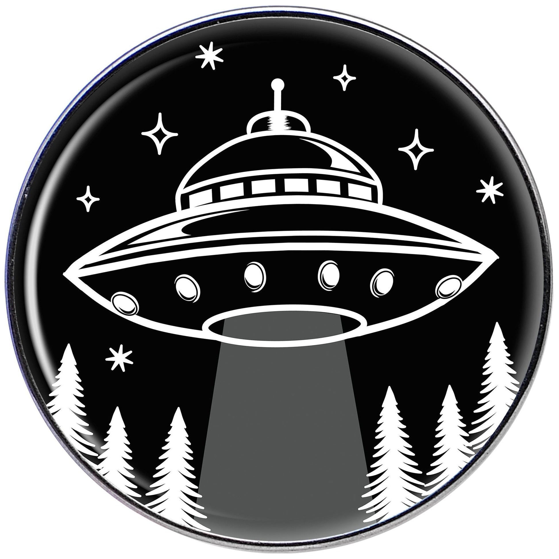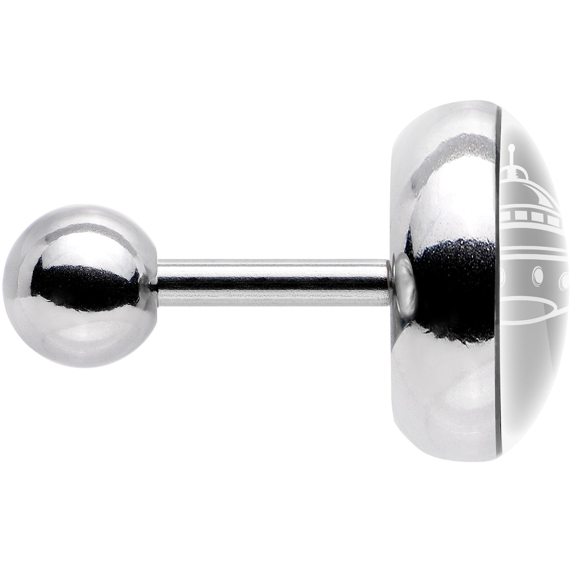 If you're always looking for visitors from outer space then this 16 gauge cartilage jewelry is right for you! Made with a 1/4" durable 316L surgical grade stainless steel straight barbell, this tragus earring features a white UFO about to beam an unsuspecting something out of the woods on a black background logo inlay.Specifications