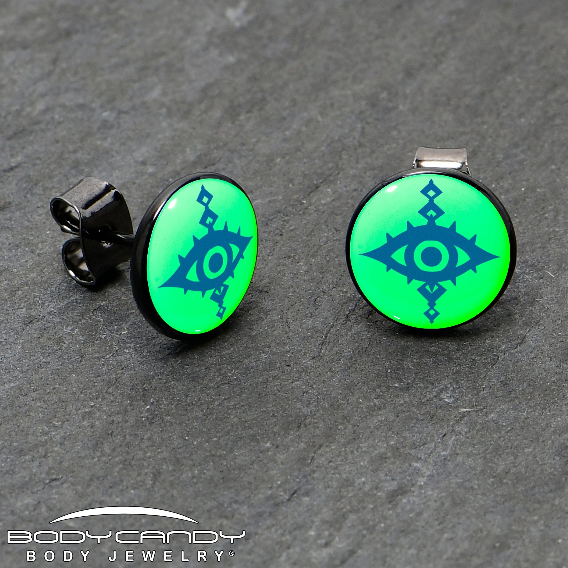 Hypoallergenic jewelry for sensitive skin.Black Anodized Evil Eye Glow in the Dark Stud Earrings