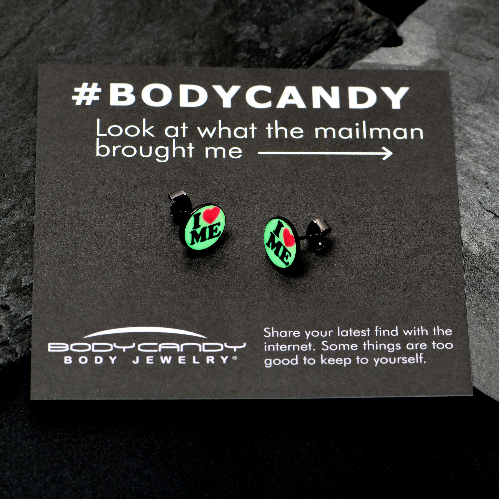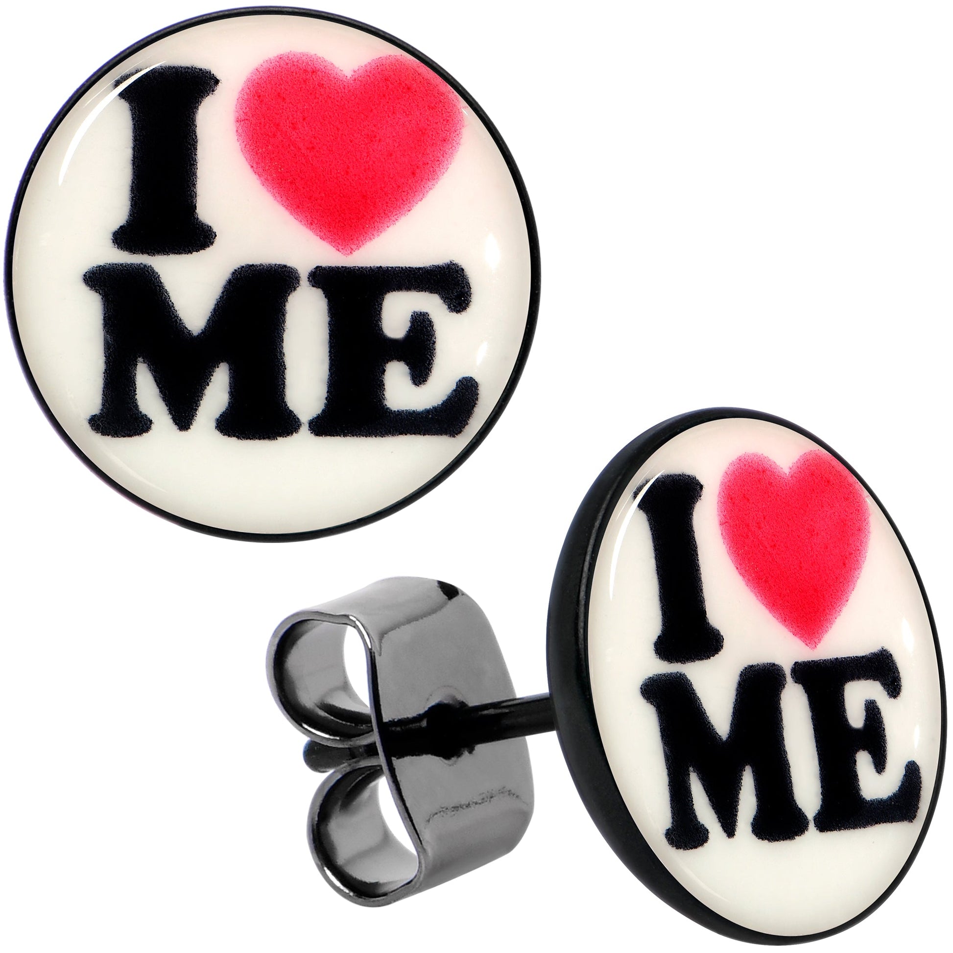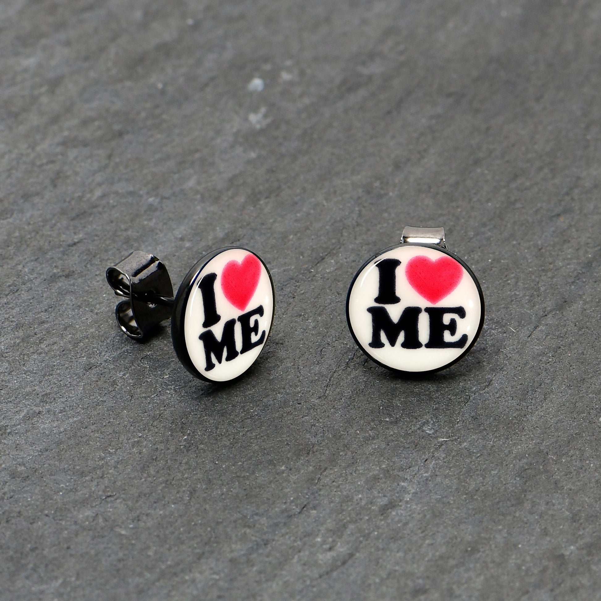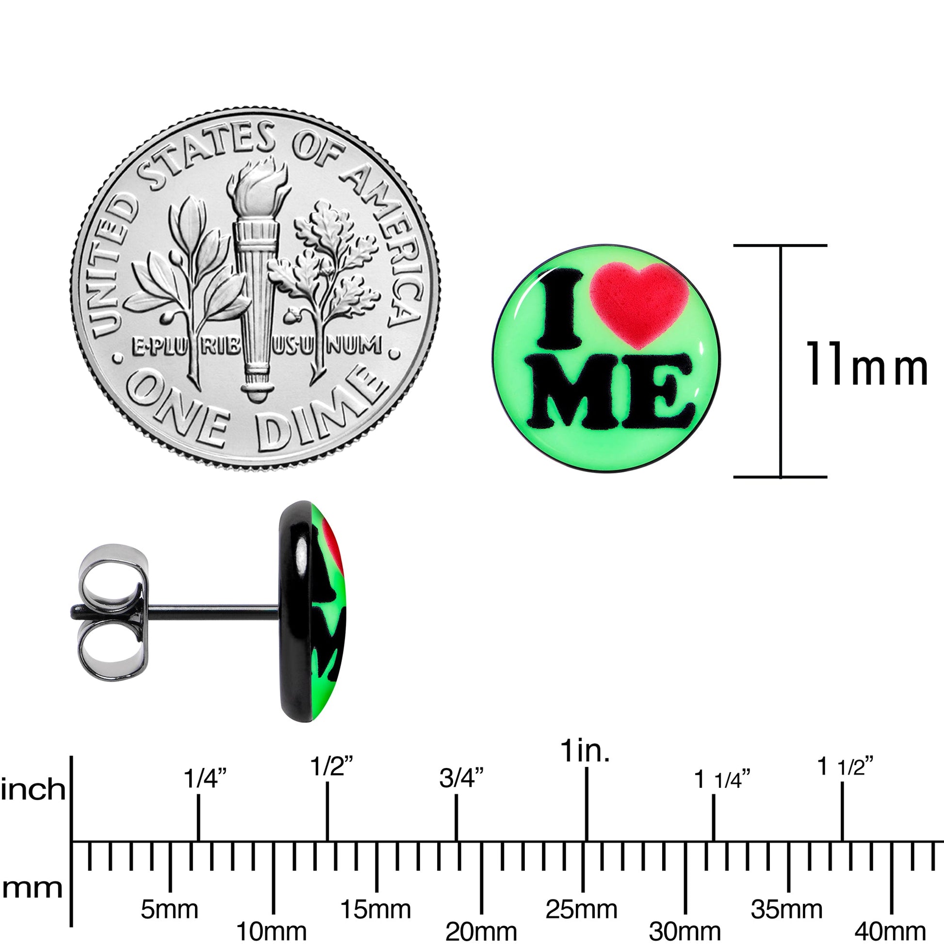 Tell the world who your number one love is with these stud earrings for pierced ears. They are made with black anodized over stainless steel straight posts with friction backs for a secure fit. They feature a white disc charm that boldly proclaims I Love Me, with a red heart adding color and when the lights go down they glows in the dark. If you're all about self love, show it off with these whimsical pierced earrings. Sold as a set of two.