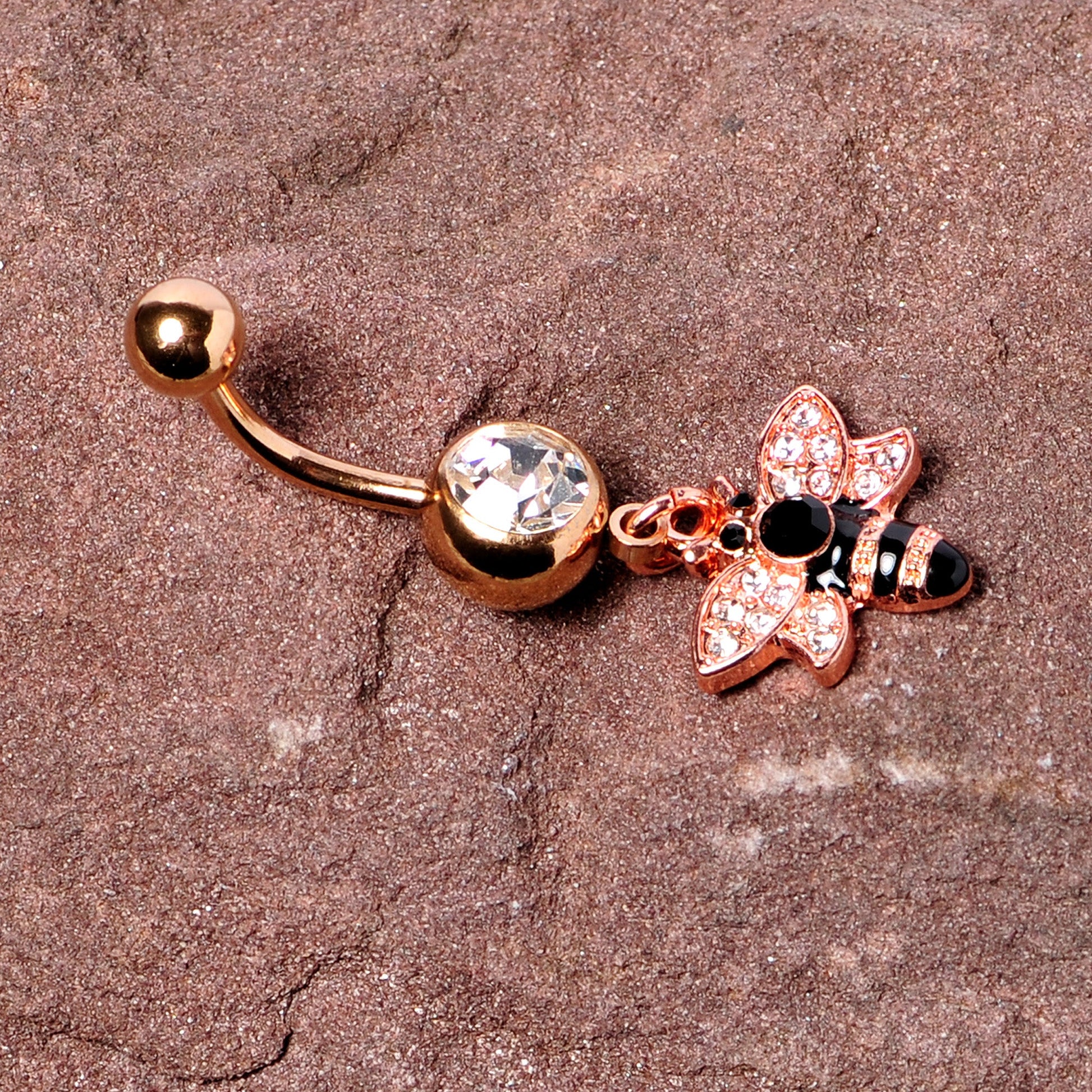You'll be absolutely infatuated with the insect on this 14 gauge navel ring! It's made with a 3/8" rose gold PVD over 316L surgical grade stainless steel curved barbell with a 5mm top ball end. The bottom ball end is 8mm and set with a large clear gem. Dangling from the base is a black bee dangle charm with a black gem set into its back. The bee has clear gems set into its wings. With this in your belly button piercing, you're sure to be all the buzz!Specifications