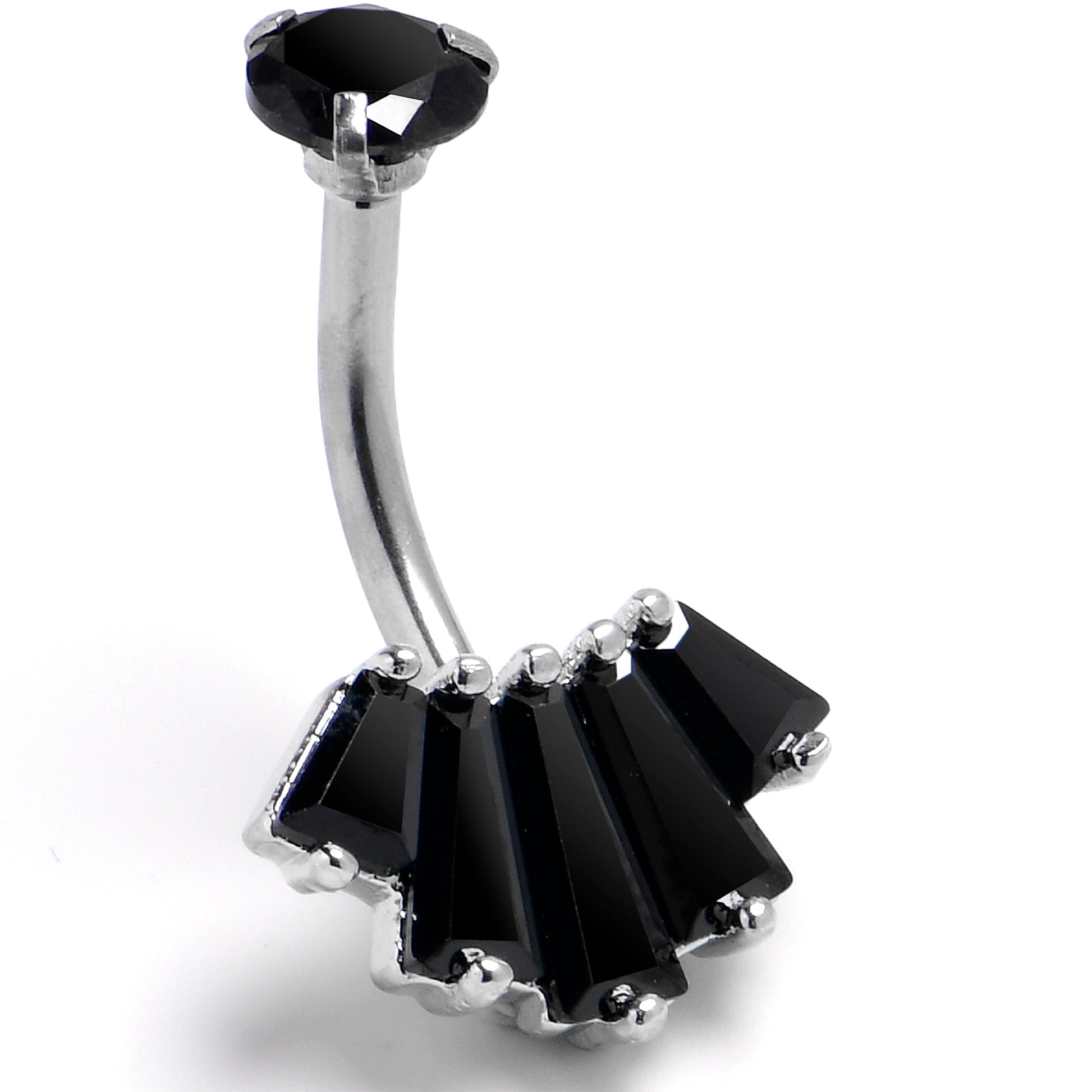 Crown your belly piercing like the royalty you know it is with this 14 gauge navel ring. It is made with a 3/8 inch 316L surgical grade stainless steel curved barbell. The top end features a round black cubic zirconia gem while the bottom features a crest of five black cubic zirconia gems that resembles a crown. It is even internally threaded to provide the utmost comfort while inserting or removing. With this belly piercing ring crowning your navel piercing, it will absolutely rule.Specifications
