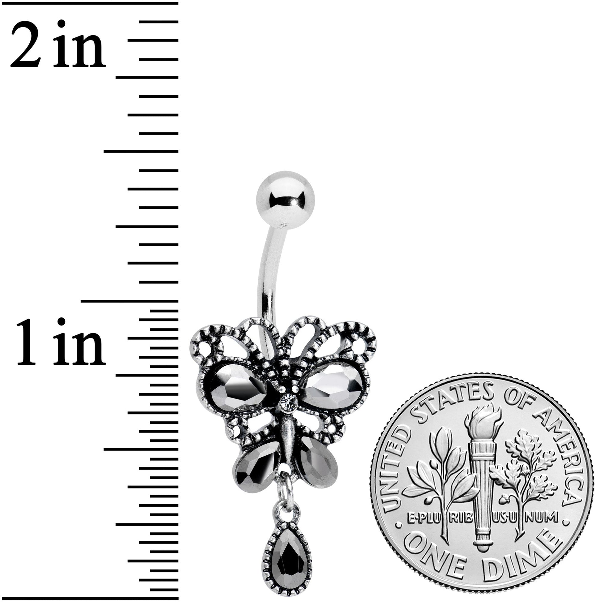 Get a little abstract with this 14 gauge navel ring! It's made with a 3/8" durable 316L surgical grade stainless steel curved barbell with a 5mm top ball end. It features a stylized bow charm, with smooth and textured loops for visual contrast. At the center, it's set with smooth black gems for an added touch of gothic style and a tiny clear gem for added contrast. Dangling from the bottom is another black gem for a cohesive and stylish appearance. Wrap your look up with a bow with this elegantly abstract belly piercing jewelry!Specifications