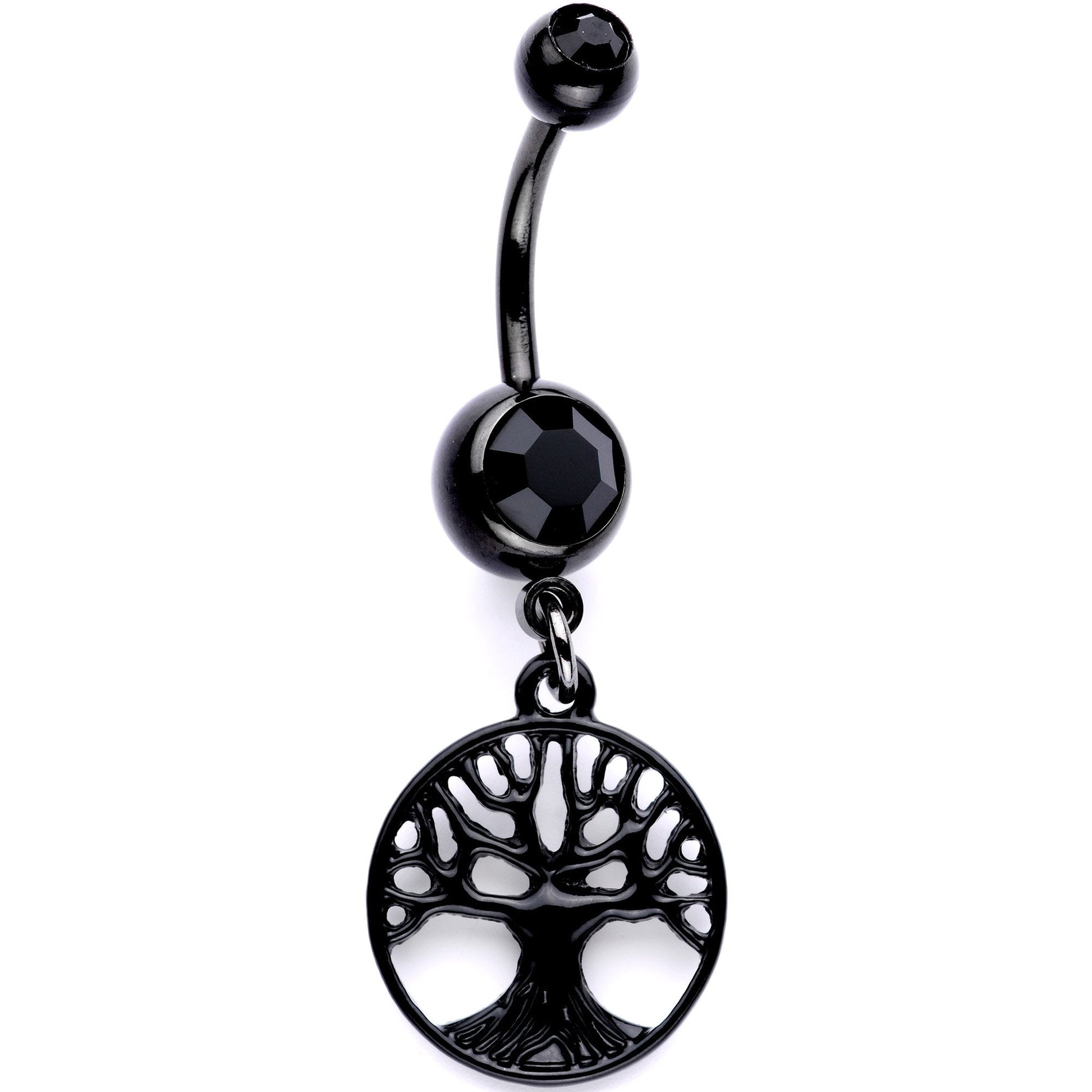 This outdoor-inspired navel piercing is a definite must-have if you're looking for something that's all about natural style. Made with a 7/16" black anodized over 316L surgical grade stainless steel curved barbell, this belly button ring features a black plated circular tree charm and a pair of top and bottom black gems that catch the eye.Specifications