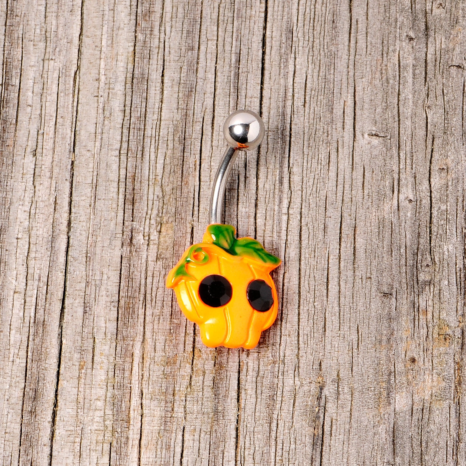 If you're ready to get into the spirit of Halloween then you will love this 14 gauge navel jewelry with scary style! Made with a 3/8" durable 316L surgical grade stainless steel curved barbell, this navel ring features an orange jack o lantern pumpkin bottom charm for magically spooky style.Specifications
