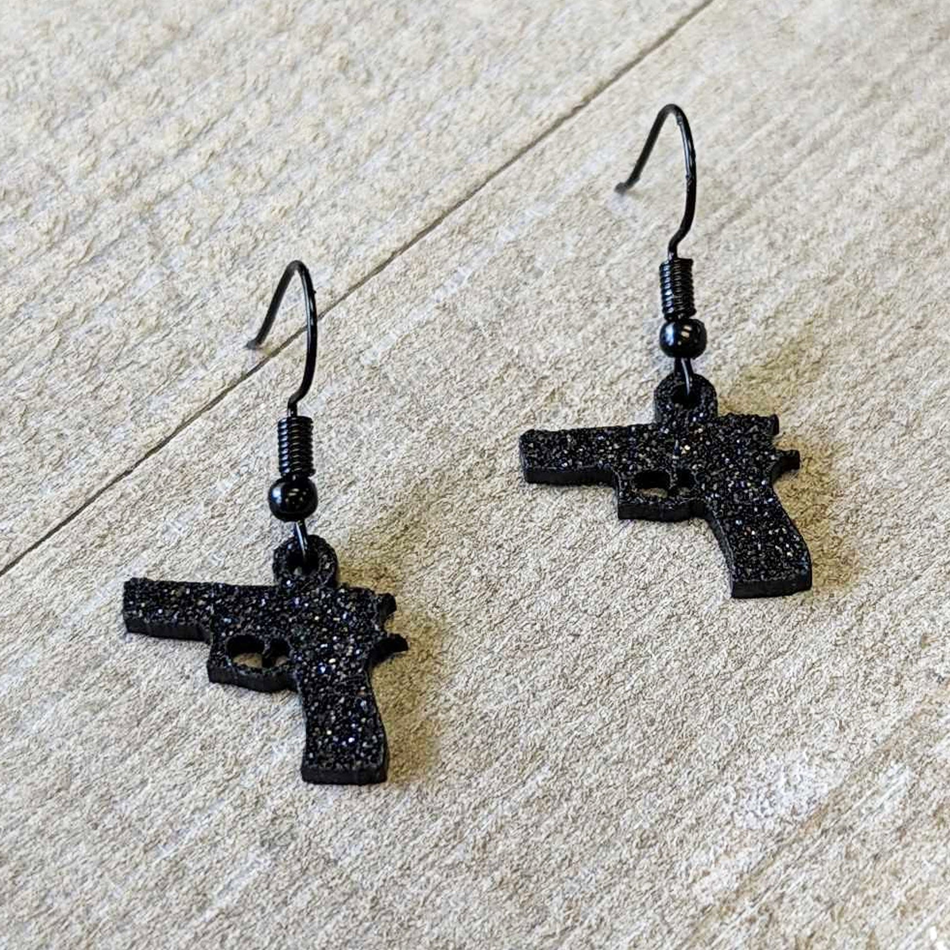 These glitter gun earrings are made with black plated fishhook wires and feature 9/16" long acrylic black glitter gun dangle charms. Get your glitter on with these charming color glitter gun dangle earrings! Sold as a set of two.Specifications