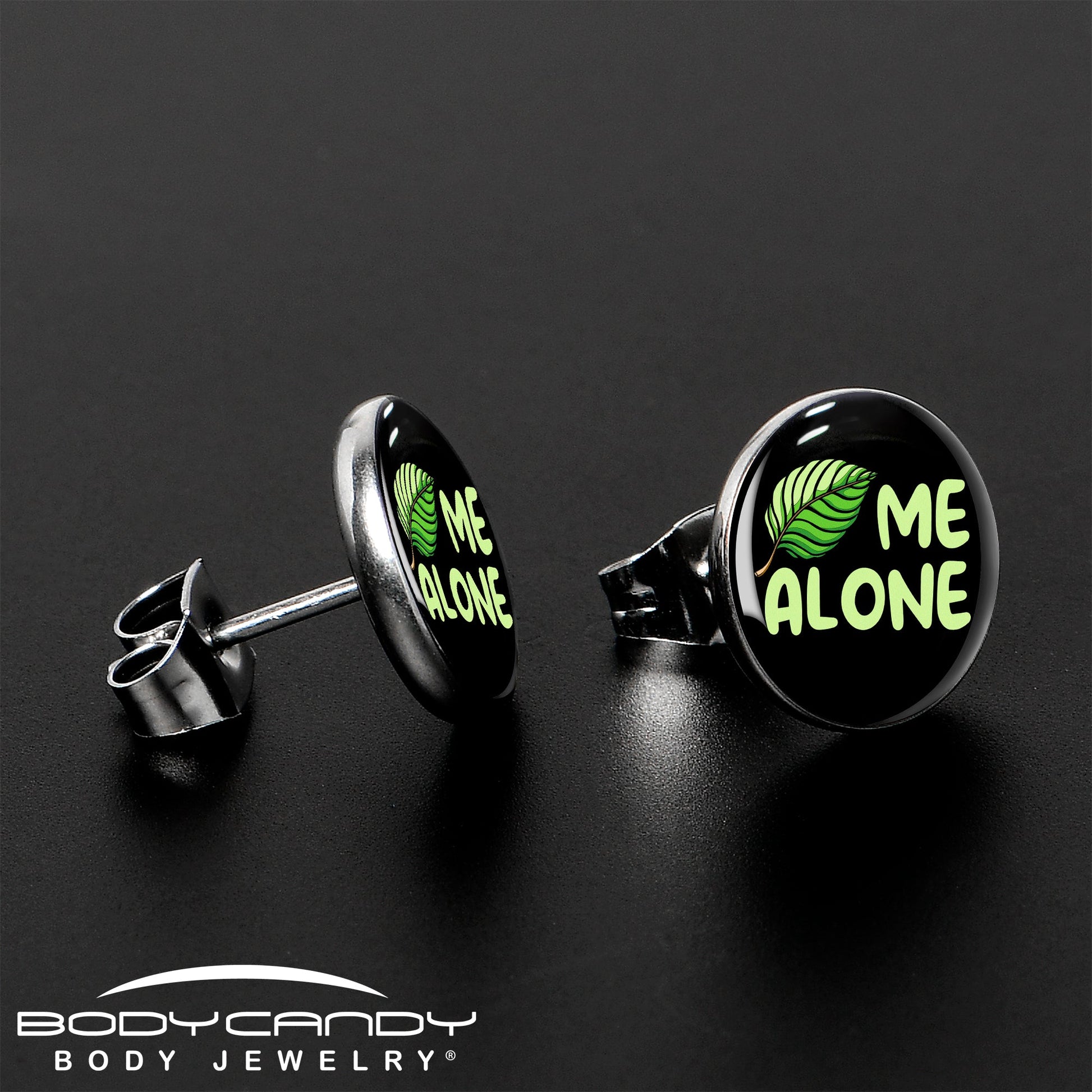 If you're a true introvert, tell the world to give you your space without actually having to talk to anyone with these stud earrings for pierced lobes. They're made with stainless steel straight posts with friction backs for a secure fit. Each one features a black disc logo charm. They feature a "leaf" Me Alone design with a tiny leaf standing in for the word in green for a colorful yet understated appearance. Avoid conversation in style with these humorous pierced earrings. Sold as a set of two.