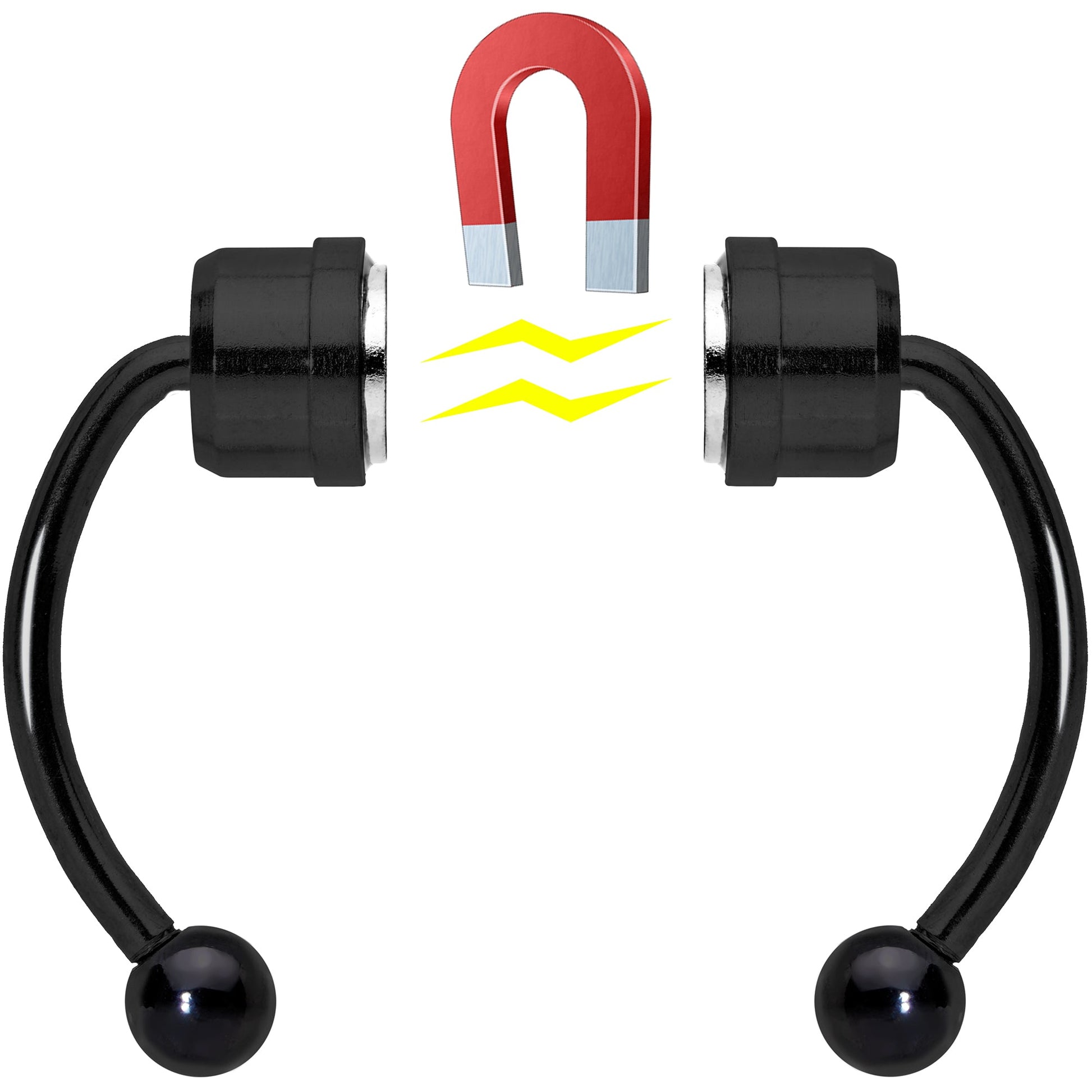 If you like the look but aren't ready to commit yet, this faux septum jewelry is perfect for you! It features a pair of magnets to hold it securely in place without the need of a trip to the piercer. It has a black electroplated finish that gives you a classic look that stands the test of time. Try out a new look before you commit with this magnetic faux septum jewelry!