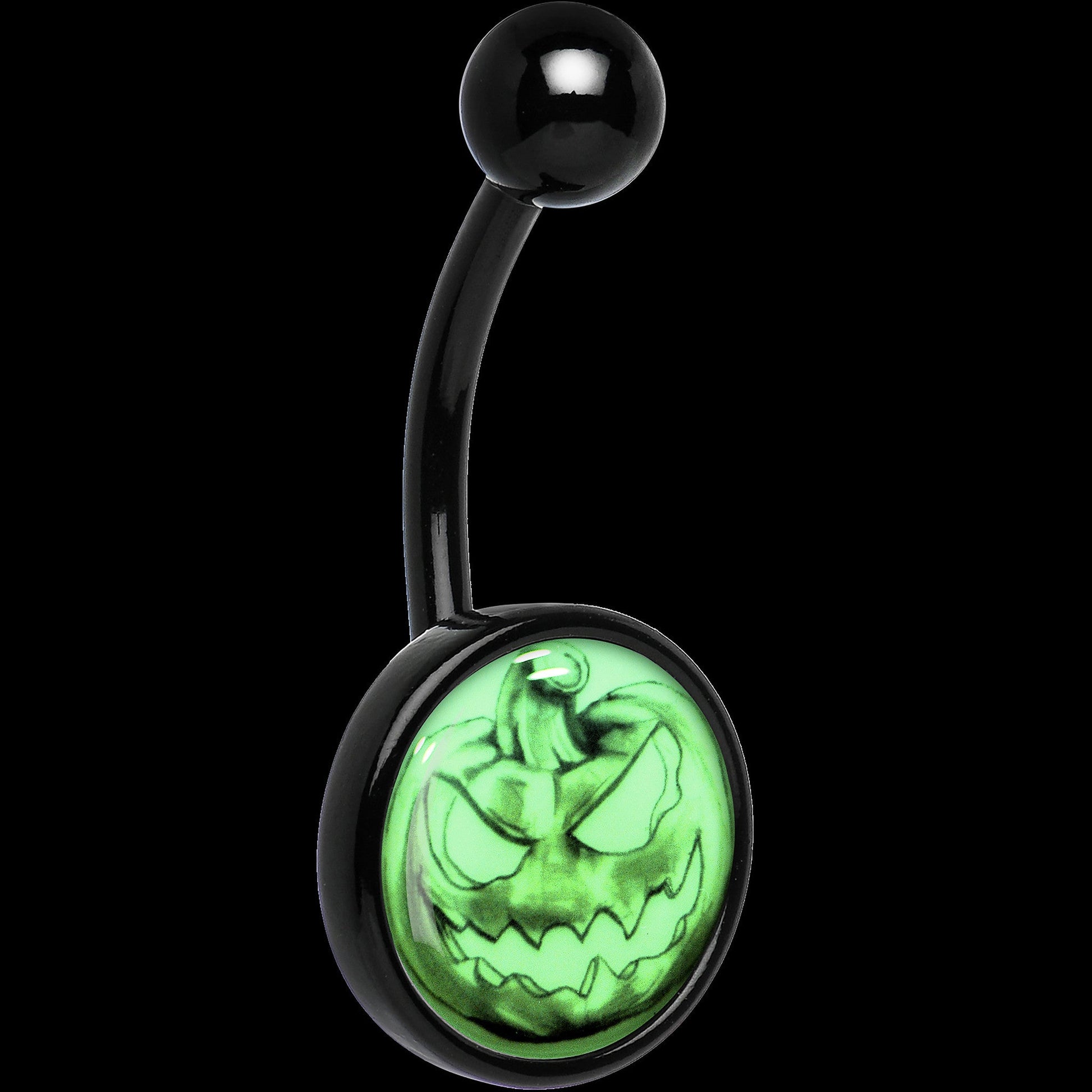 The jack o' lantern on this glow in dark belly button ring may look a bit evil, but he gives off a mystical light that will delight any Halloween lover. The classic carved pumpkin navel ring is fashioned from gleaming black anodized titanium over 316L sur