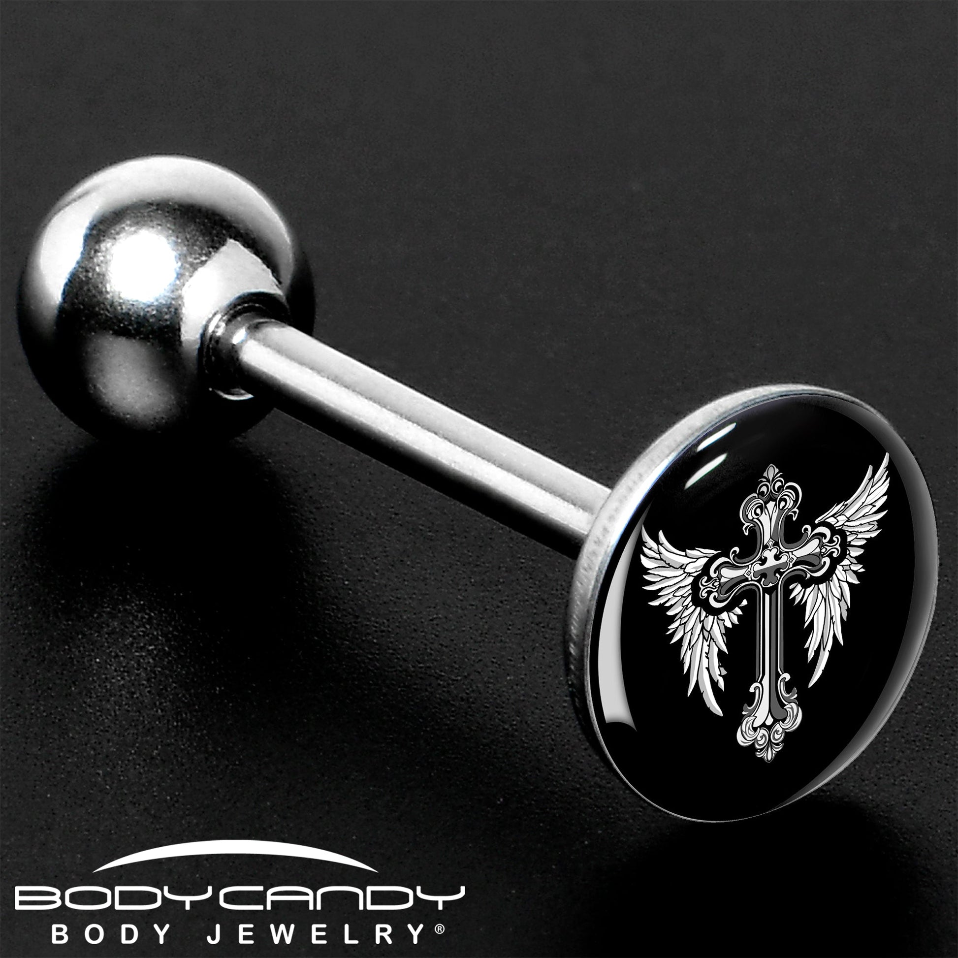 Hypoallergenic jewelry for sensitive skin.Black White Winged Cross Barbell Tongue Ring