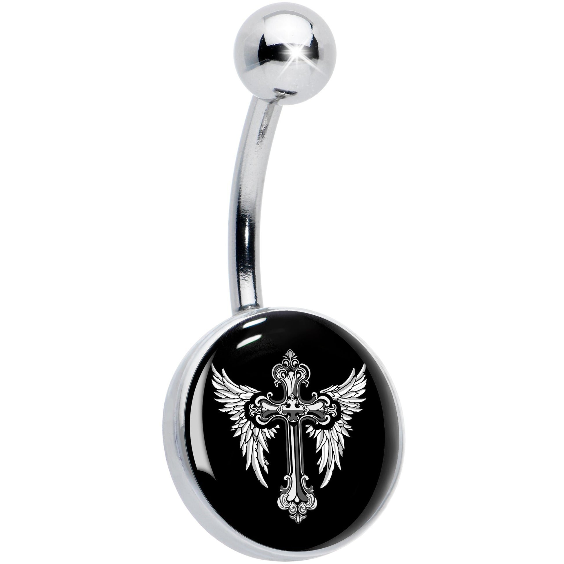 Hypoallergenic belly ring for sensitive skinBlack White Winged Cross Belly Ring