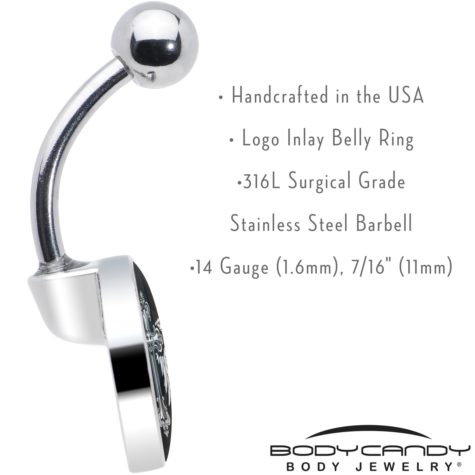 Give your soul some wings with this 14 gauge navel ring. It's made with a 7/16 inch 316L surgical grade stainless steel curved barbell with a 5mm top ball end. The bottom end features a cross charm, with detailed wings on a black background, for a look that mixes spirituality with style. Give your look a lift while honoring your beliefs with this winged cross belly piercing jewelry.