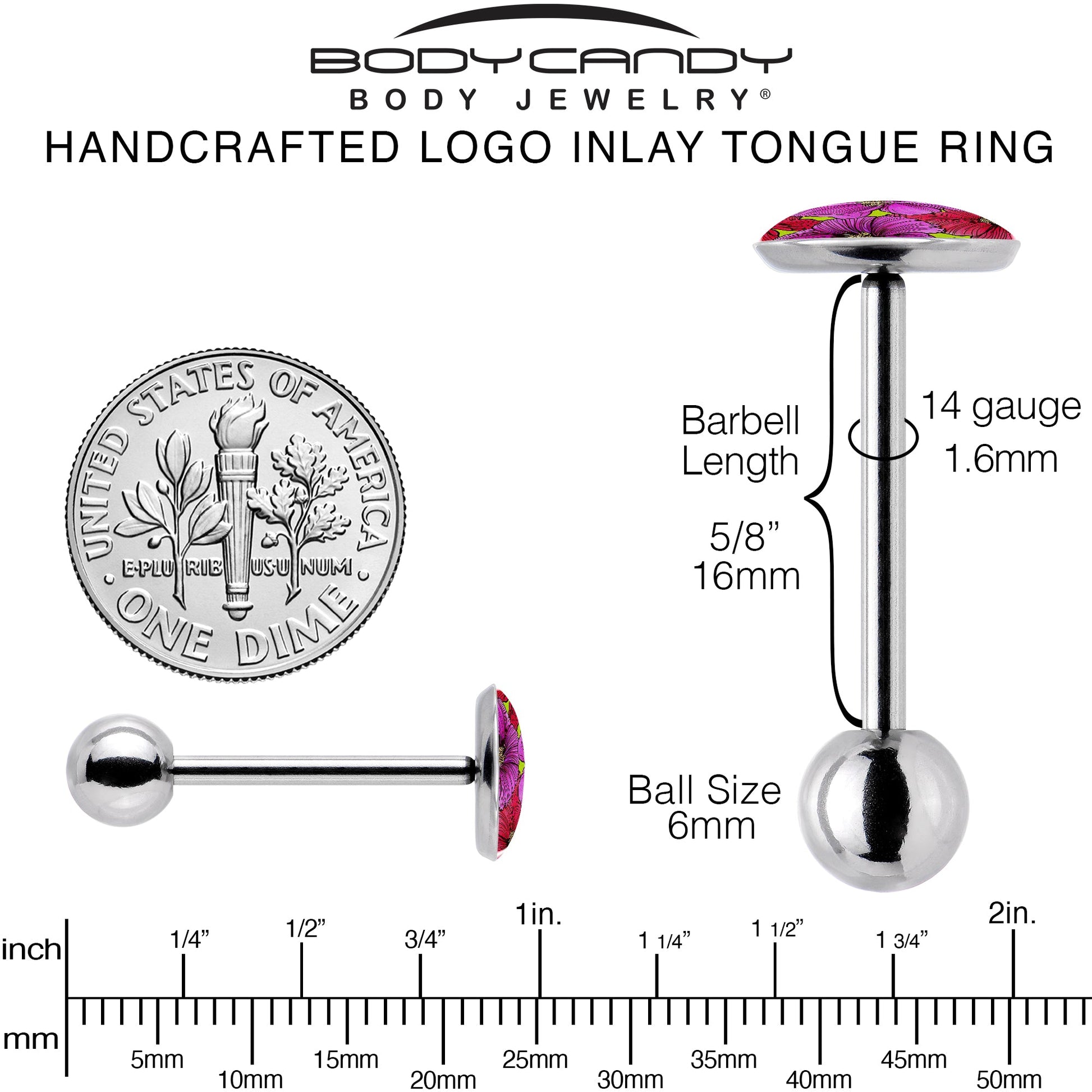 This 14 gauge artist hand drawn flower tongue jewelry is part of our new line of Blossom Creations body piercing jewelry for the season. This 5/8 inch tongue barbell is made with a 316L surgical grade stainless steel straight barbell with a 6mm bottom ball end. It features a logo inlay charm with rich purple and red flowers, on a contrasting background for a striking look. Bring on the heat with the exotic beauty of this floral tongue piercing jewelry.