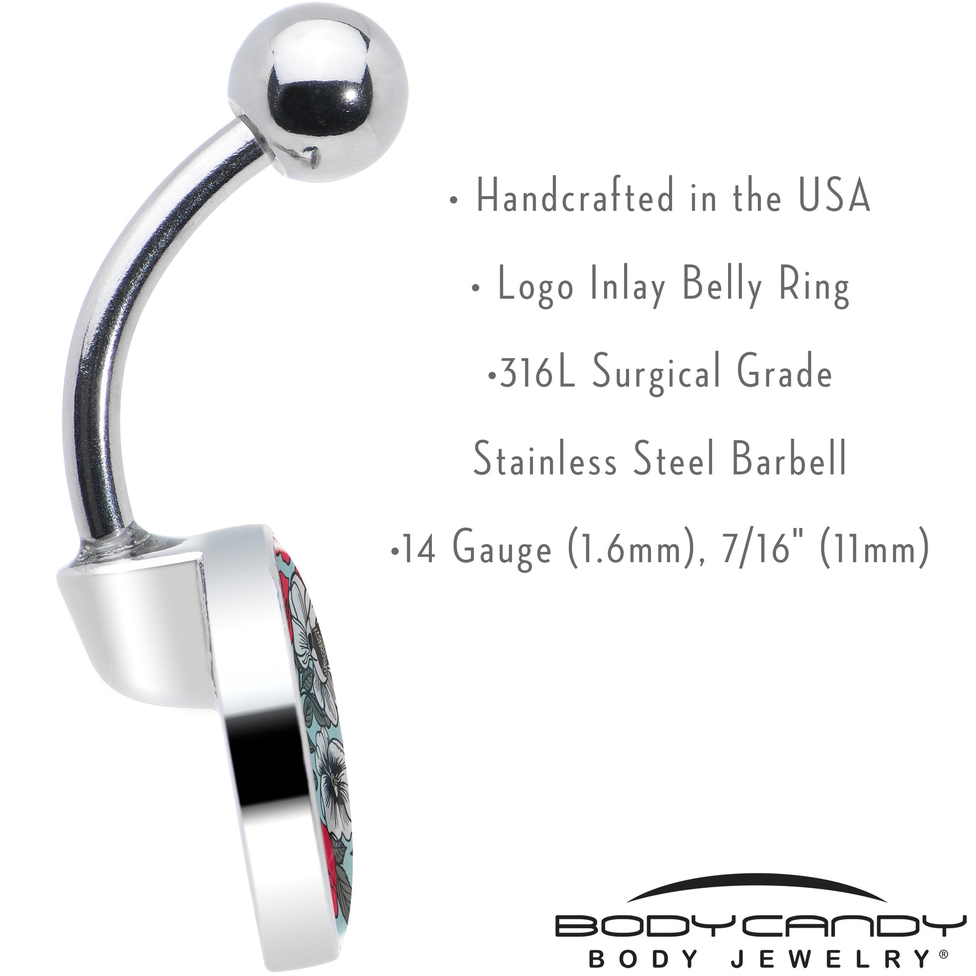This artist 14 gauge hand drawn flower belly ring jewelry is part of our new line of Blossom Creations body piercing jewelry for the season. This 7/16 inch navel ring is made with a 316L surgical grade stainless steel curved barbell with a 5mm top ball end. The bottom end features a logo inlay charm with an eruption of vibrant red flower taking center stage. You'll be blossoming with this romantic flower belly piercing jewelry.