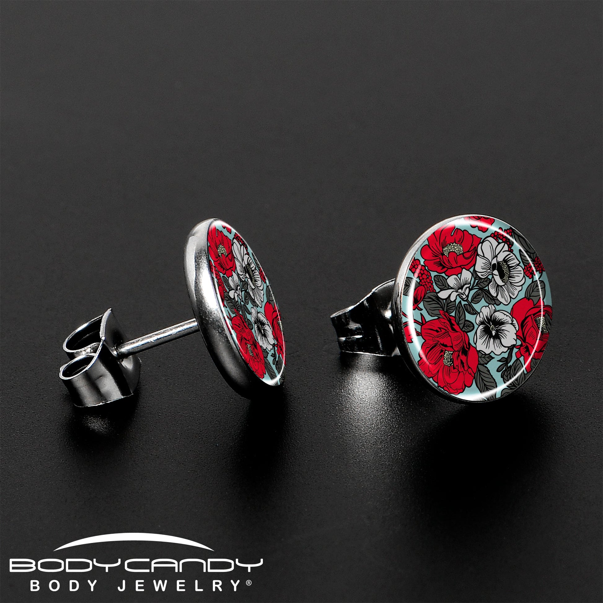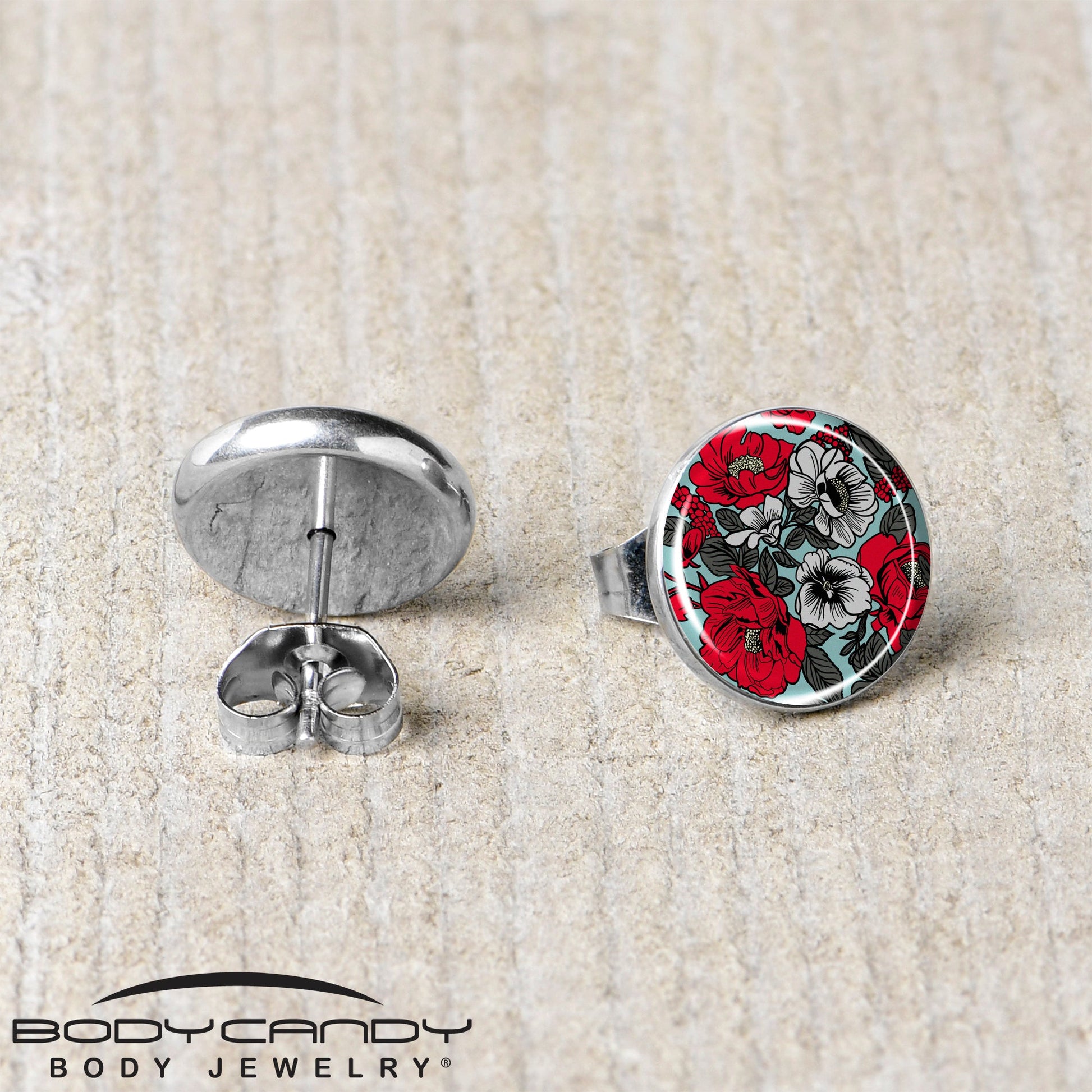 This artist hand drawn flower earrings jewelry is part of our new line of Blossom Creations body piercing jewelry for the season. They're made with stainless steel straight posts with friction backs for a secure fit. These stud earrings for pierced lobes features a logo inlay charm with an eruption of vibrant red flower taking center stage. You'll be coming up roses with these romantic rose stud earrings. Sold as a set of two.