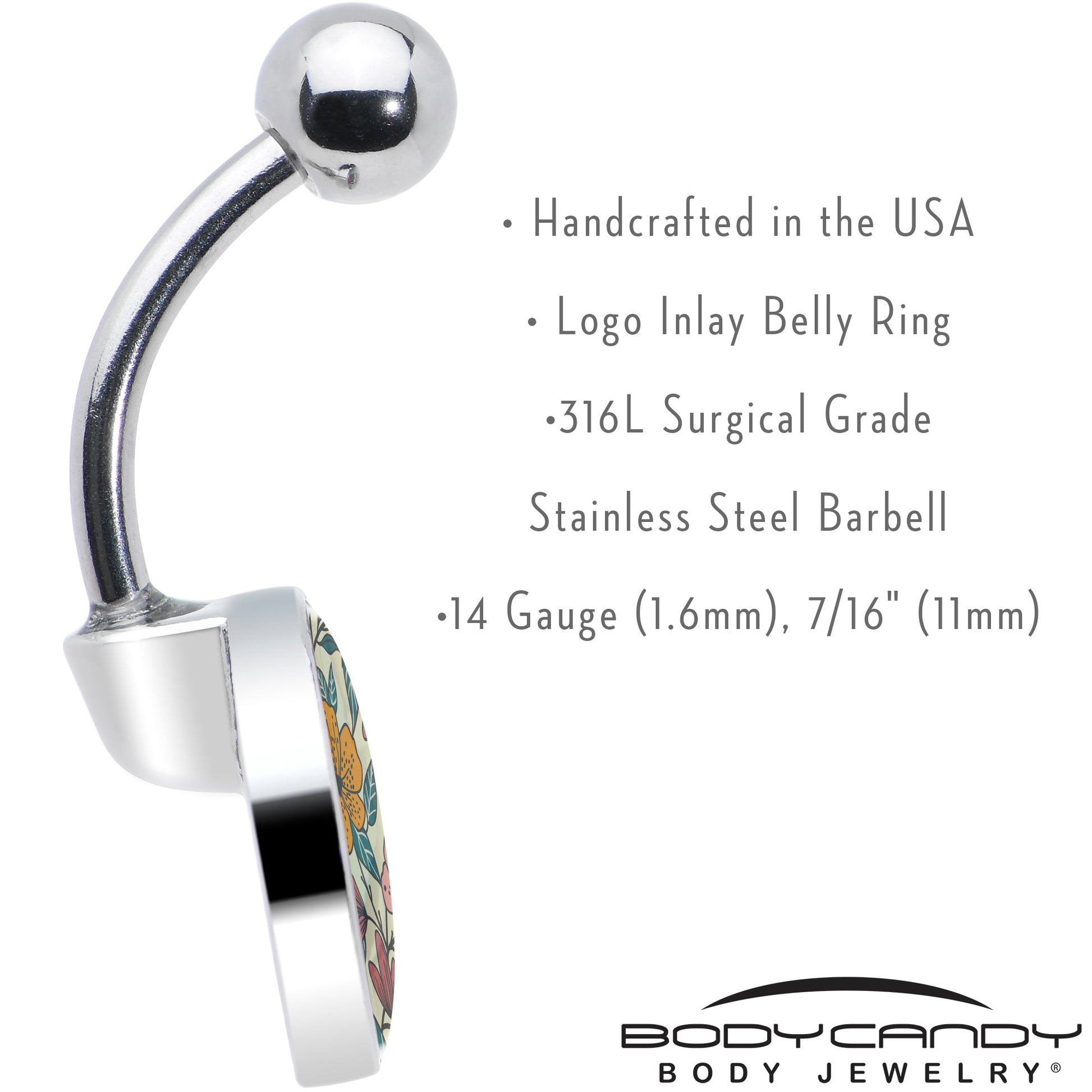This 14 gauge artist hand drawn flower belly ring jewelry is part of our new line of Blossom Creations body piercing jewelry for the season. This 7/16 inch navel ring is made with a 316L surgical grade stainless steel curved barbell with a 5mm top ball end. The bottom end features a logo inlay charm with an array of earth-toned wildflowers. Get a little wild and let style bloom with this fabulous floral belly piercing jewelry.