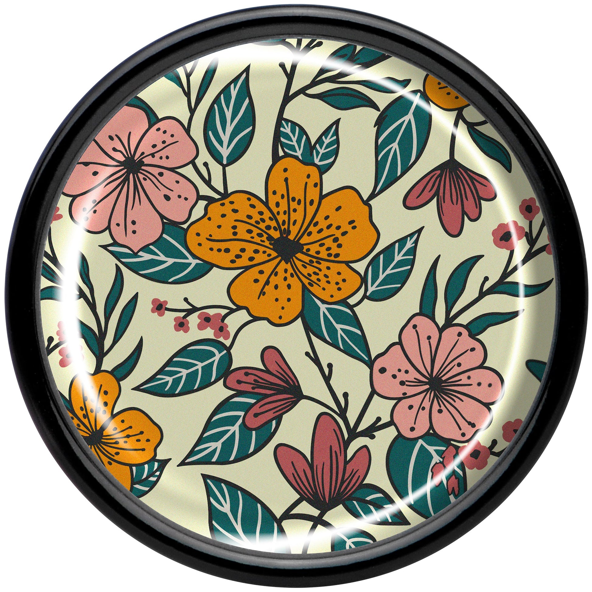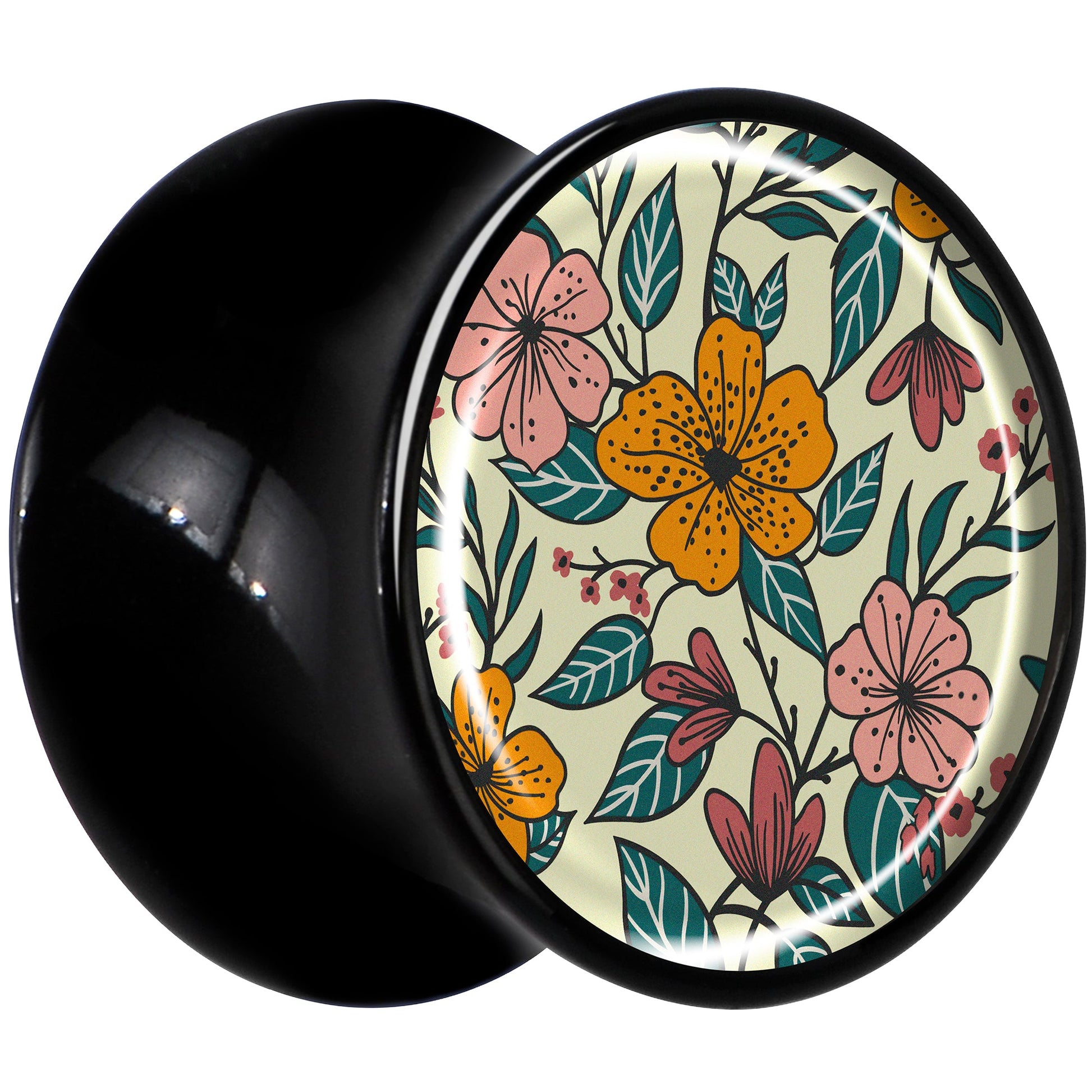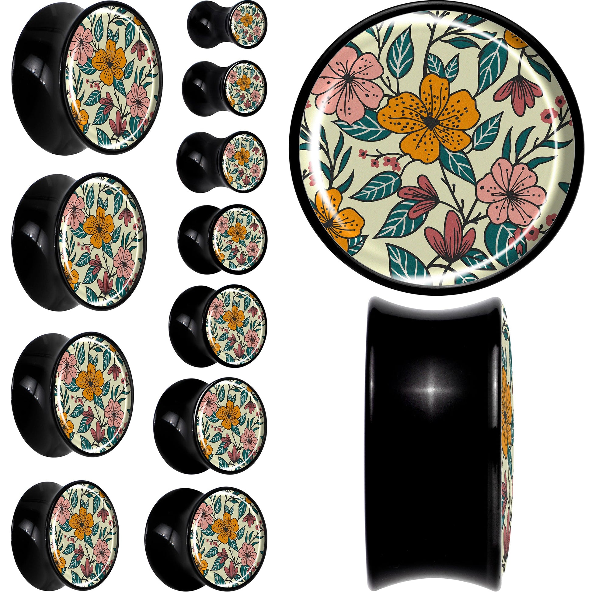 This artist hand drawn flower jewelry is part of our new line of Blossom Creations body piercing jewelry for the season. These plugs for stretched lobes are made with black acrylic and feature a saddle design for comfortable insertion and removal. Each one features a logo inlay charm with an array of earth-toned wildflowers. Get a little wild and let style bloom with these fabulous floral ear gauges. Sold as a set of two.