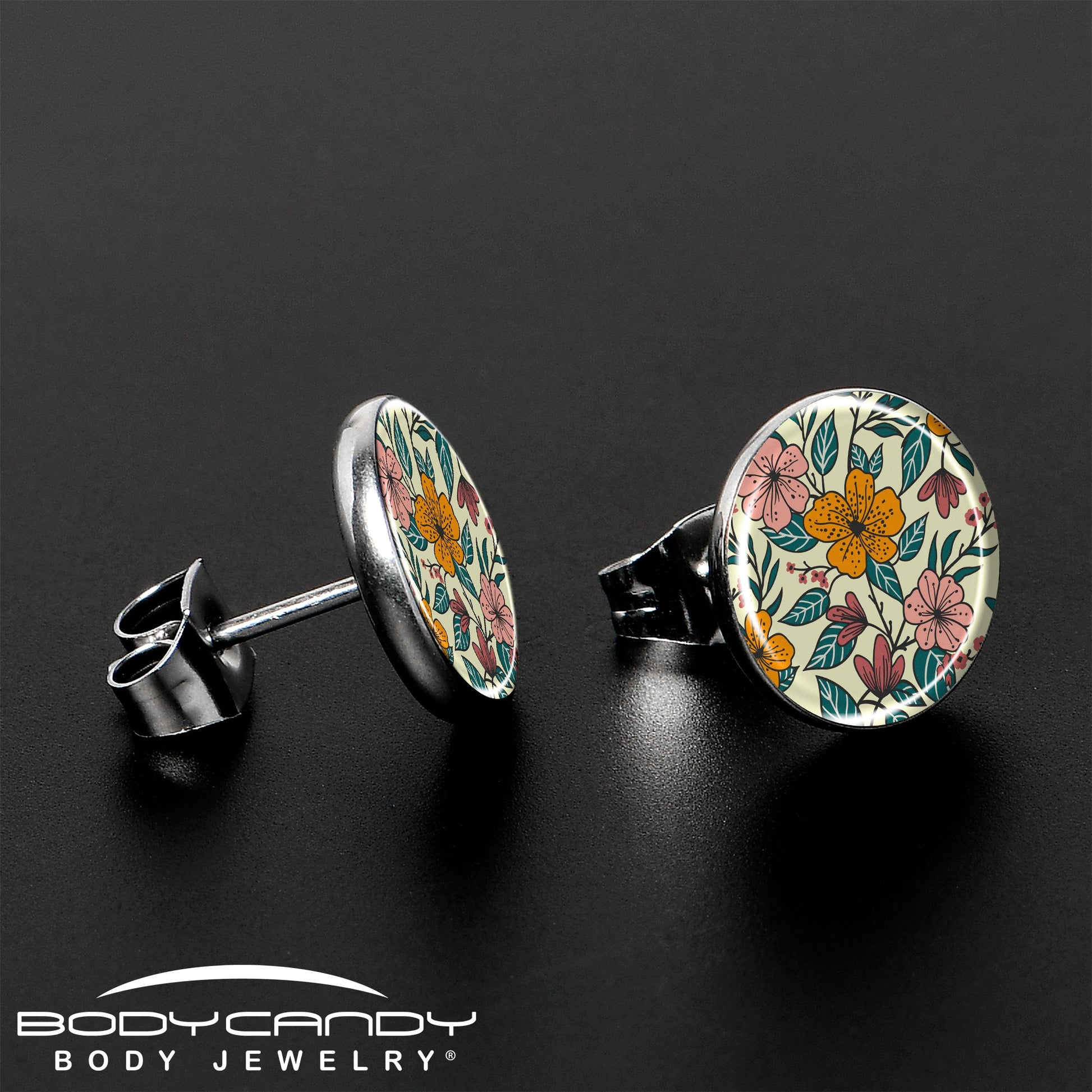 This artist hand drawn flower earring jewelry is part of our new line of Blossom Creations body piercing jewelry for the season. They're made with stainless steel straight posts with friction backs for a secure fit. These stud earrings for pierced lobes features a logo inlay charm with an array of earth-toned wildflowers. Get a little wild and let style bloom with these fabulous floral earrings. Sold as a set of two.