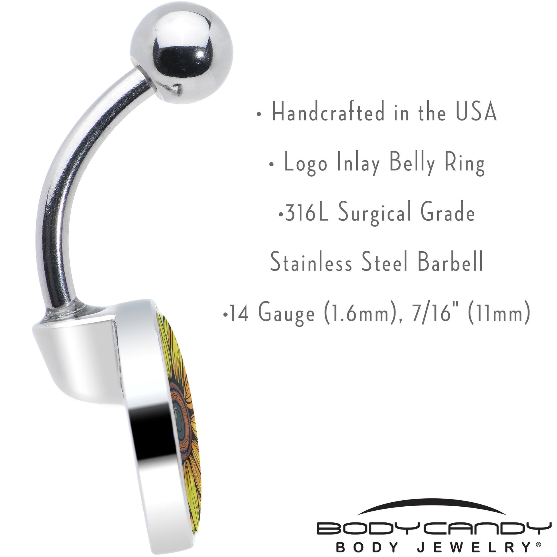 This 14 gauge artist hand drawn flower belly ring jewelry is part of our new line of Blossom Creations body piercing jewelry for the season. This 7/16 inch navel ring is made with a 316L surgical grade stainless steel curved barbell with a 5mm top ball end. The bottom end features a logo inlay charm with a bright yellow sunflower blooming to show off its brown center. You'll be feeling stylish and sunny with this fabulously floral belly piercing jewelry.