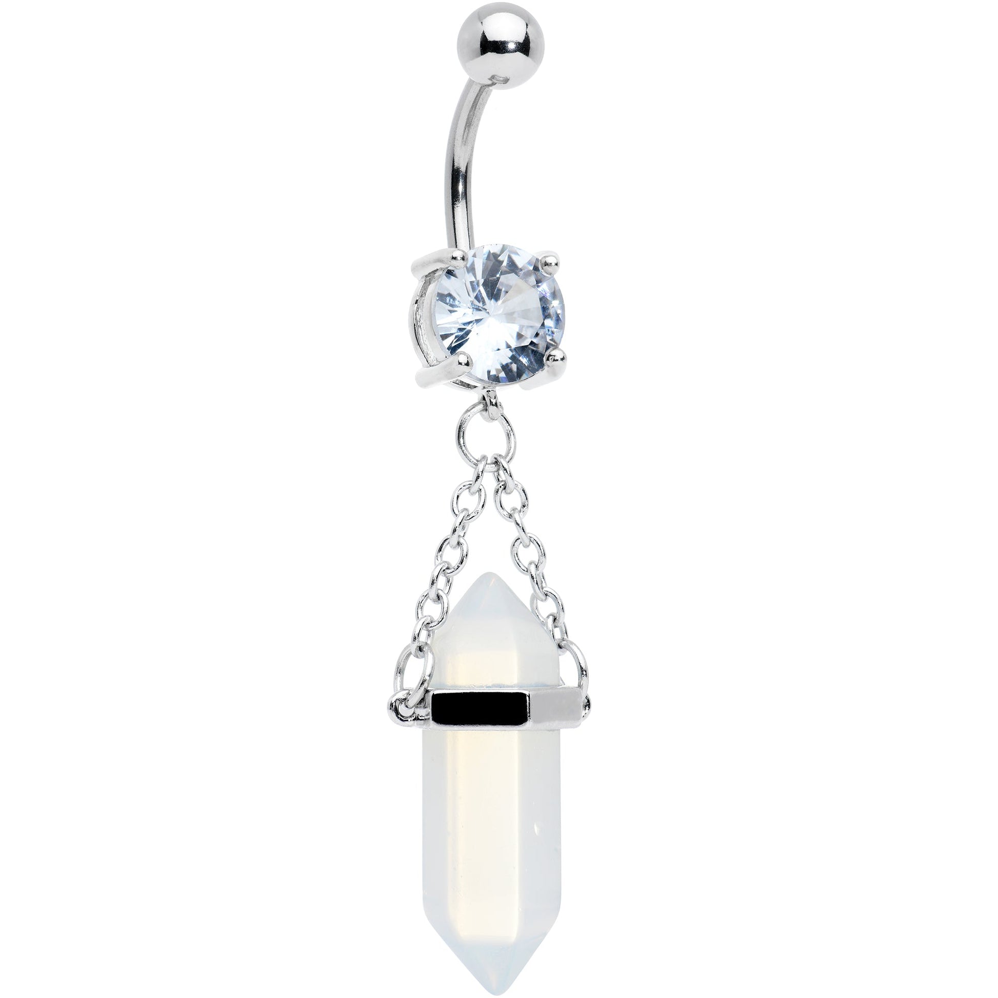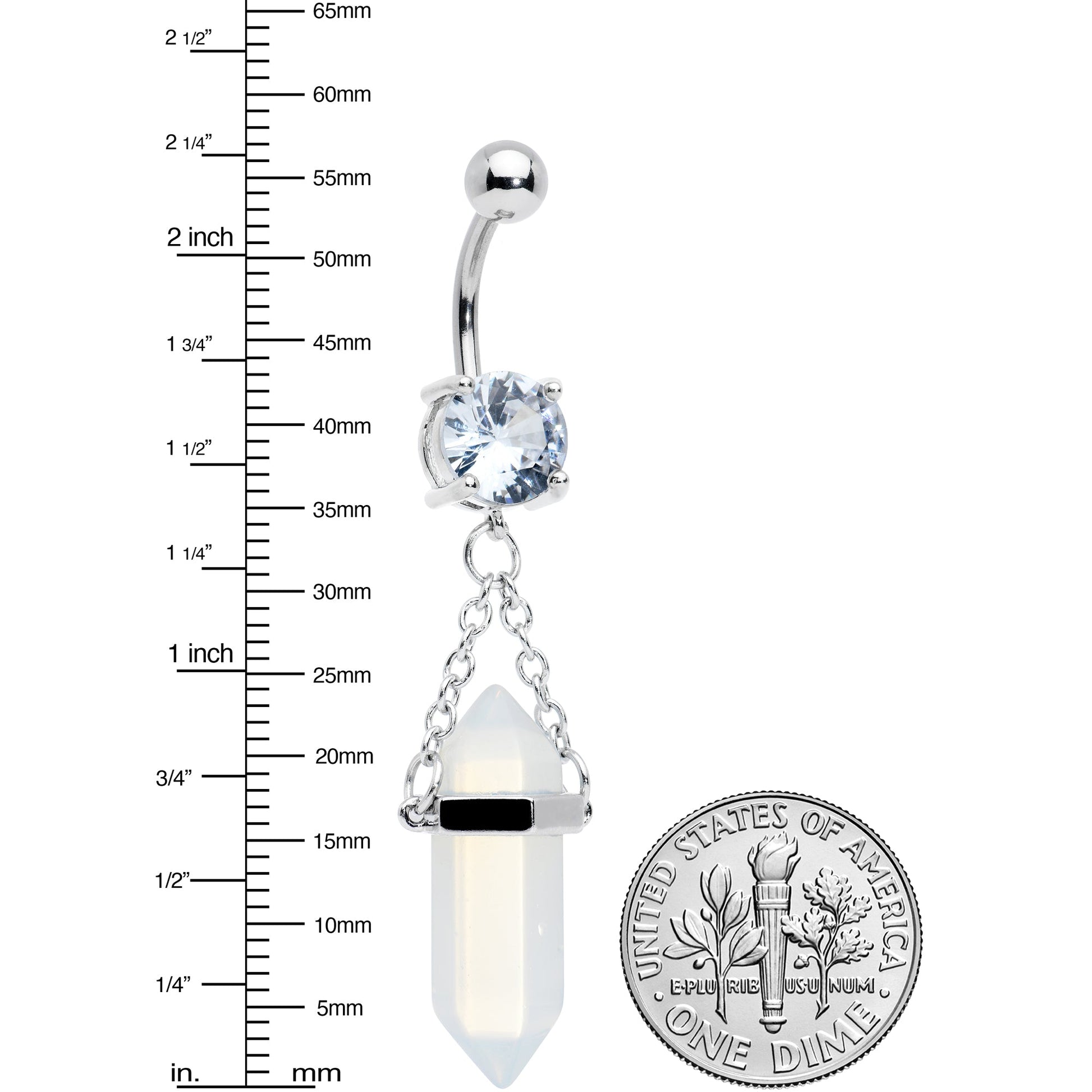 If you're into crystals and incense, this 14 gauge navel ring is sure to give you a happier aura! It's made with a 7/16" durable 316L surgical grade stainless steel curved barbell with a 5mm top ball end. The bottom ball end is a large clear cubic zirconia gem. Dangling beneath that is a pale blue beryl stone that would be so popular among the hippies of the '60s, with its classic obelisk shape. While we can't claim it has any magical powers, it will certainly look magical in your belly button piercing!Specifications