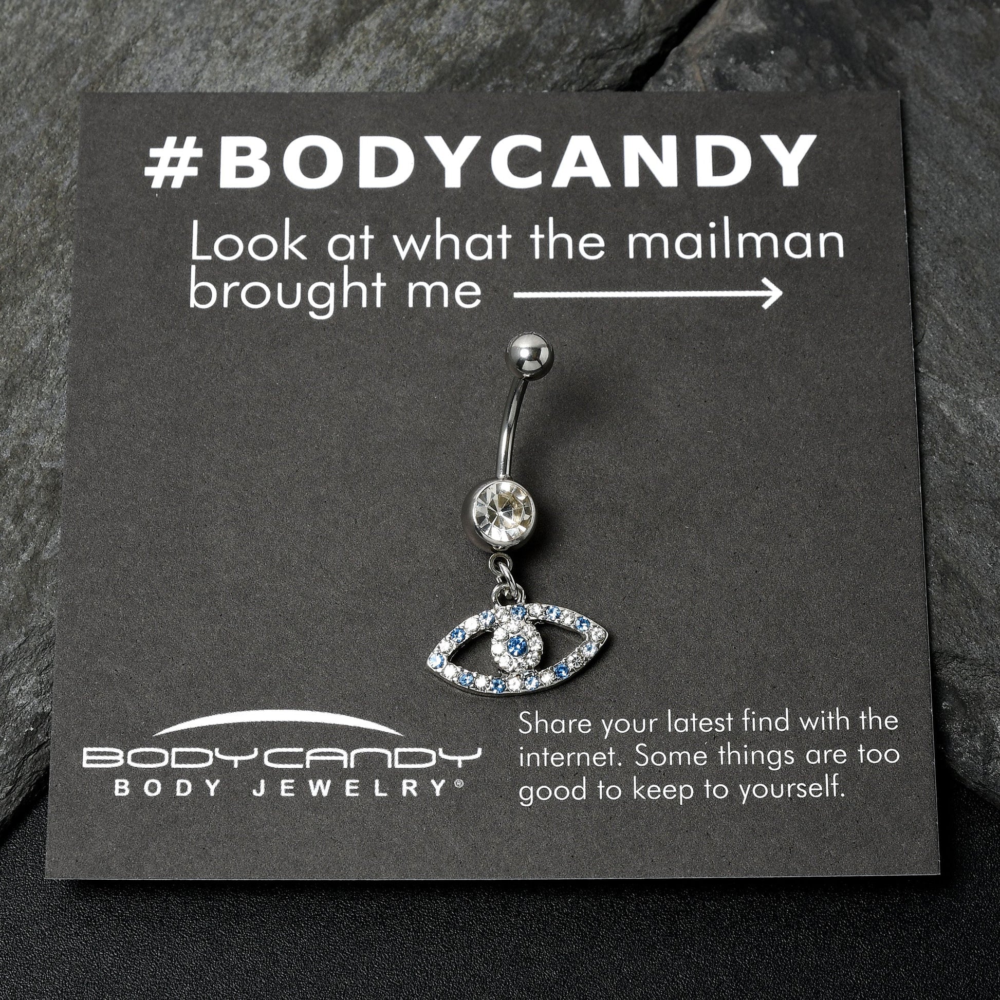 Keep your eyes open and you will spot amazing things - like this 14 gauge navel ring. It is made with a 3/8 inch durable 316L surgical grade stainless steel curved barbell with a 5mm top ball end. The bottom ball end is 8mm and set with a clear gem.Dangling beneath is an eye charm, with the rim paved in blue and clear gems. The center of the eye features more clear and blue gems for a cohesive look. You will have all eyes on you with this eye-opening belly piercing ring.Specifications