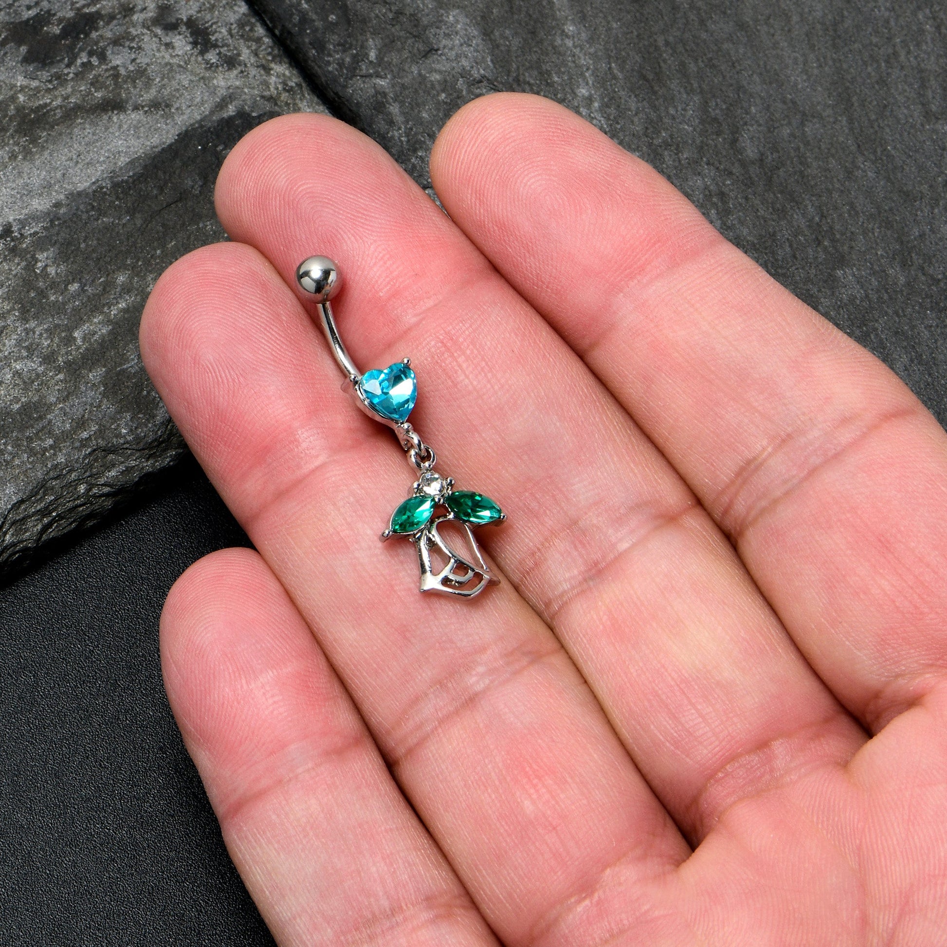 Blue CZ Gem Heart And Rose Dangle Belly Ring