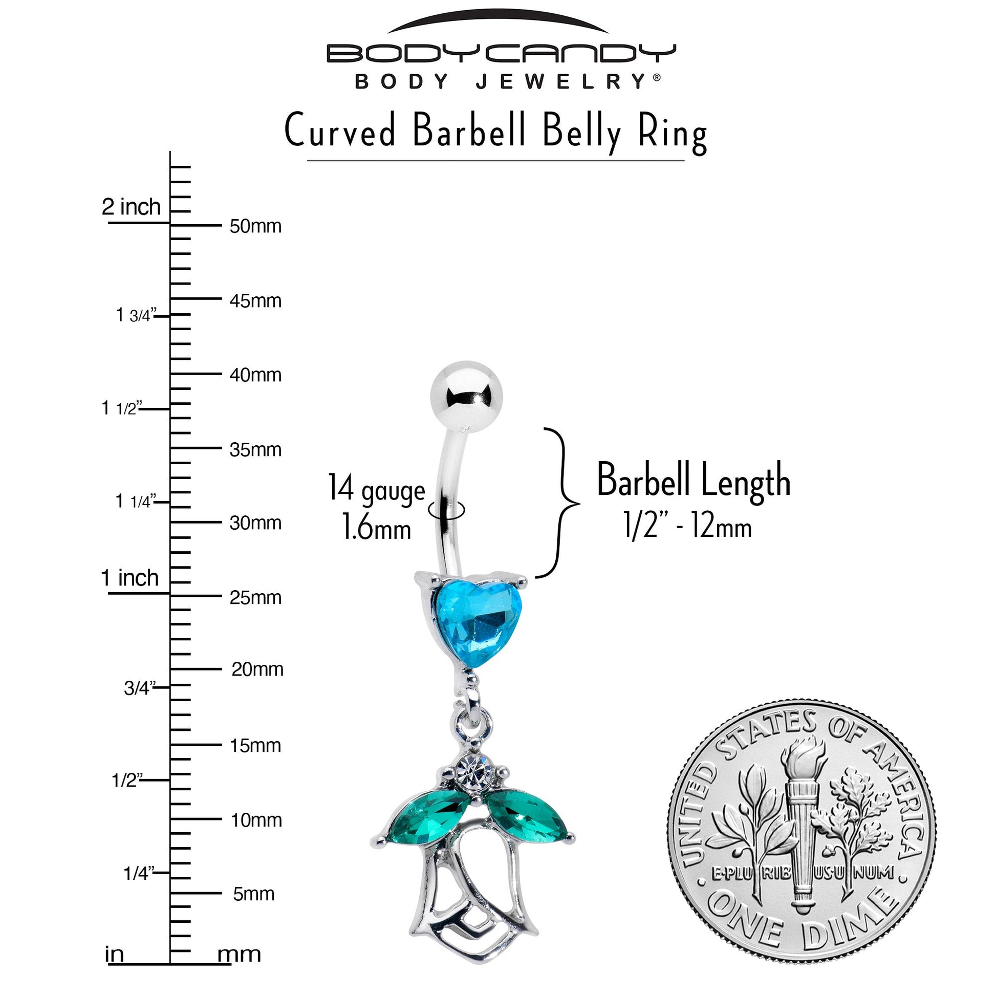 What could be more romantic than this 14 gauge navel jewelry? It is made with a 3/8 inch 316L surgical grade stainless curved barbell with a 5mm top ball end. The bottom features a blue cubic zirconia gem in the shape of a heart. Dangling beneath the heart is a rose charm, with the leaves composed of green cubic zirconia gems and an airy, openwork design. Fall in love with this richly romantic belly piercing ring.Specifications