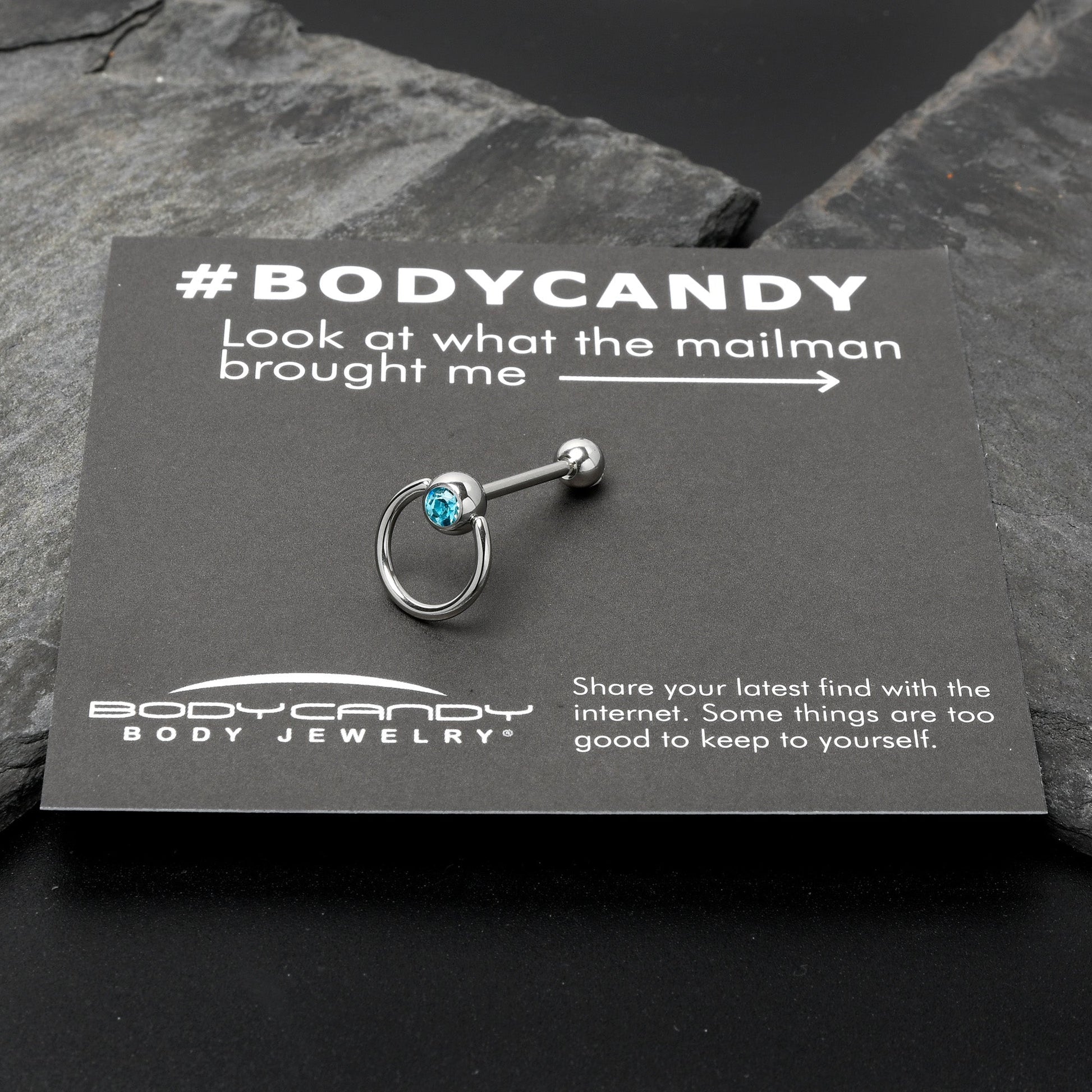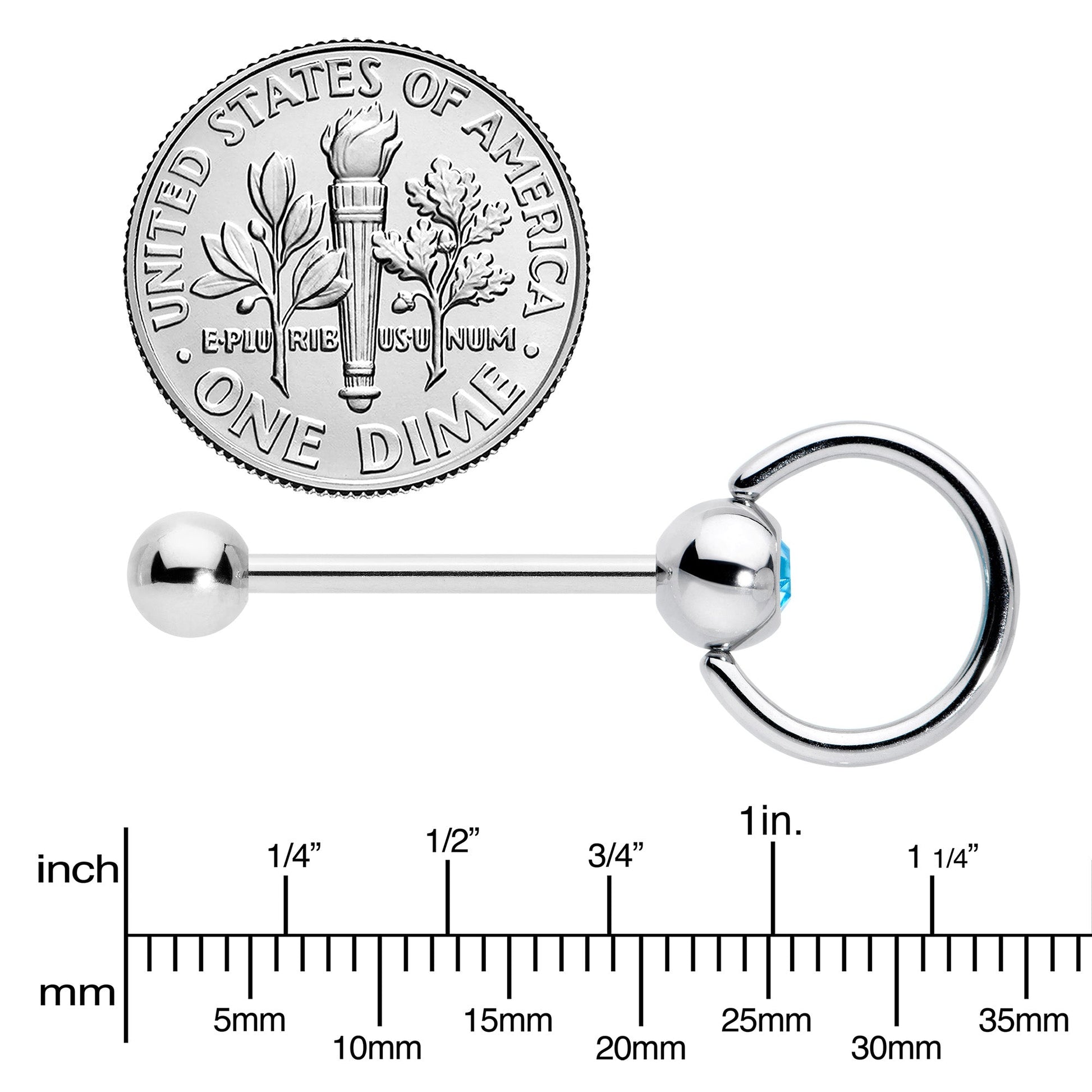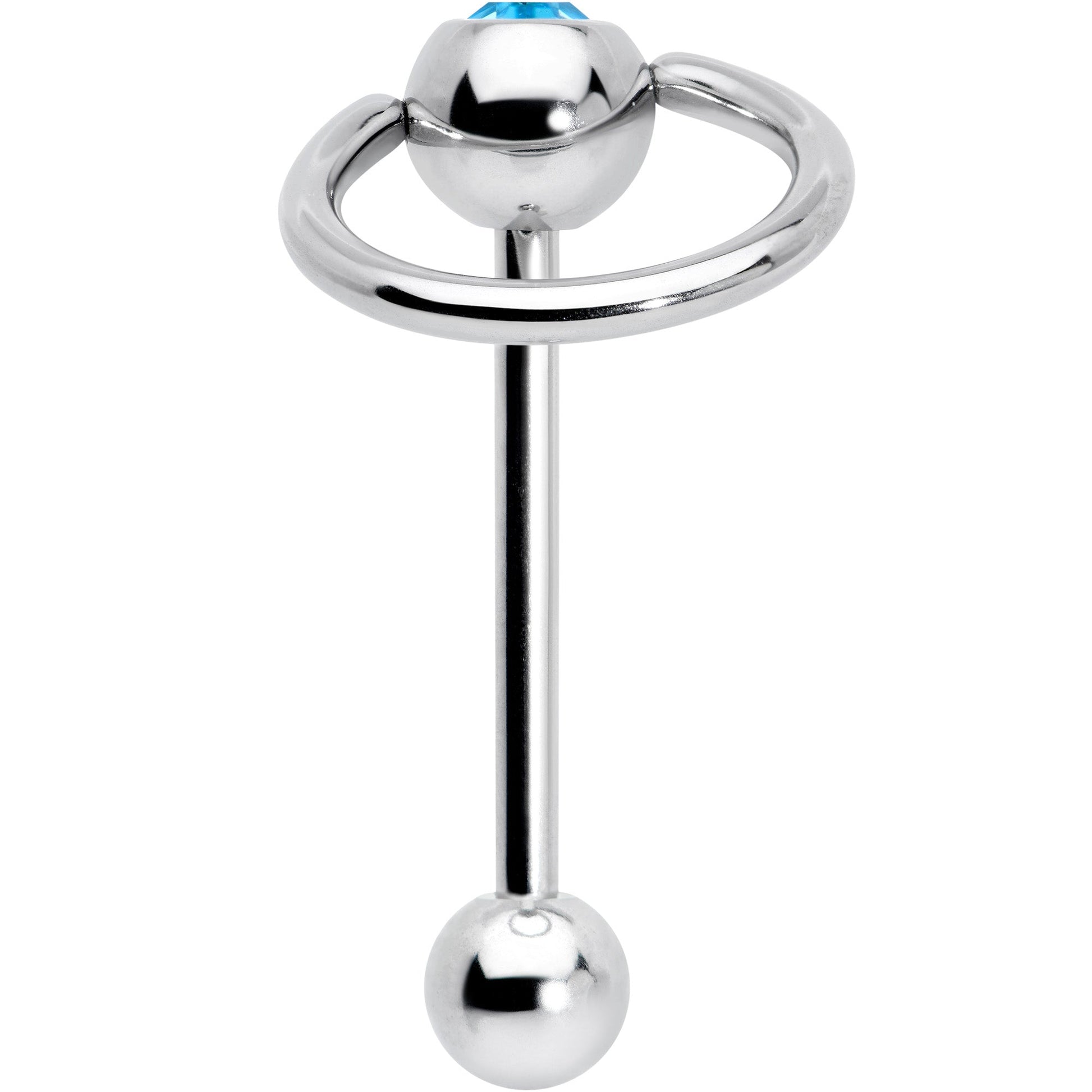 Hold the world captive with this 14 gauge tongue jewelry. It is made with a 5/8 inch 316L surgical grade stainless steel straight barbell with a 5mm bottom ball end. The top end features a 5mm ball end, set with a blue gem. It also features an attached captive ring, for a truly vibrant combination of captive bead ring and straight barbell. This tongue piercing ring is clearly the best and most stylish of both worlds.Specifications