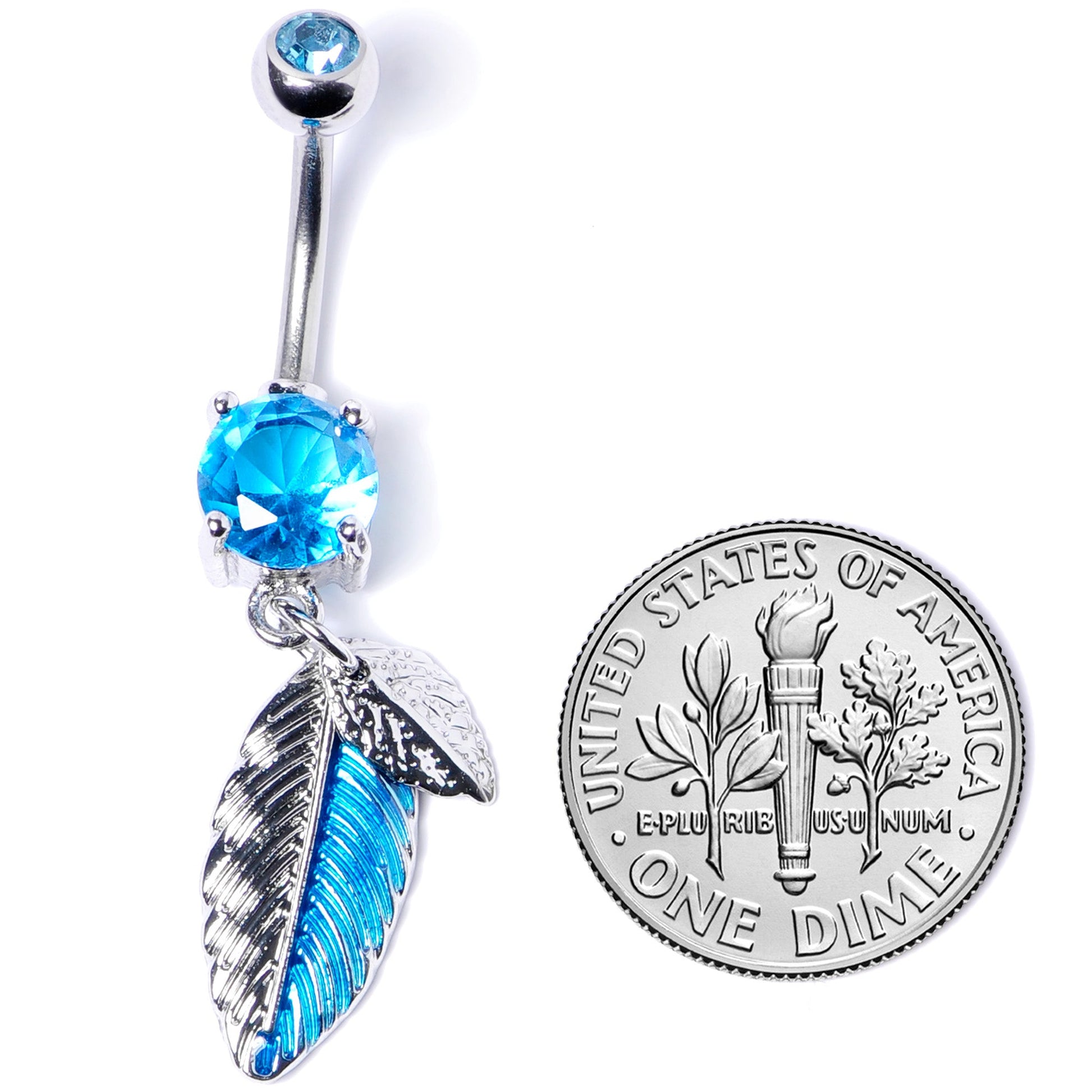 This navel ring is sure to make your heart take flight and soar away! This 14 gauge belly button jewelry is made with a 3/8" durable 316L surgical grade stainless steel curved barbell. It has a 5mm top ball end which is set with a blue gem. The bottom end is a single large blue gem. Dangling from the base are two feather charms. The larger one is silver-tone on one half and blue on the other. The other feather is smaller and lies on top of the larger one, adding extra dimension and depth to the piece. Take your look to new heights with this feather-inspired dangle navel jewelry.Specifications