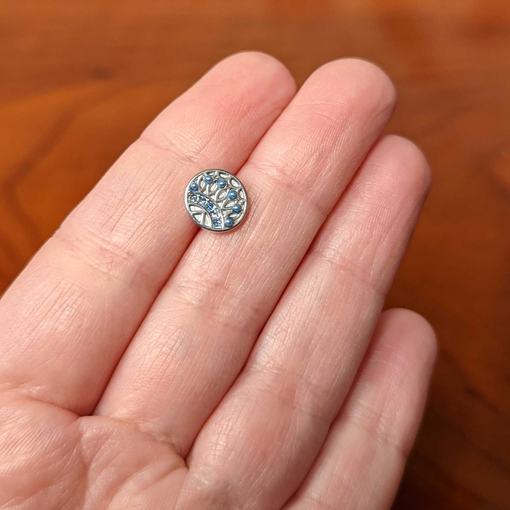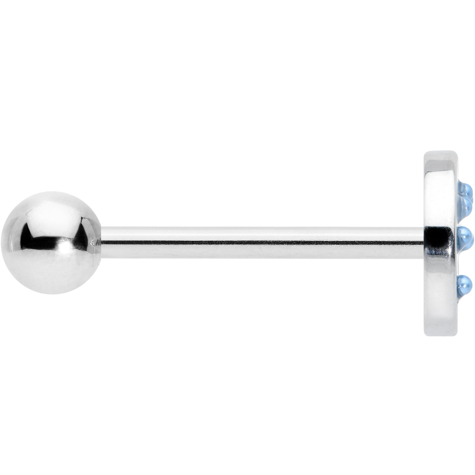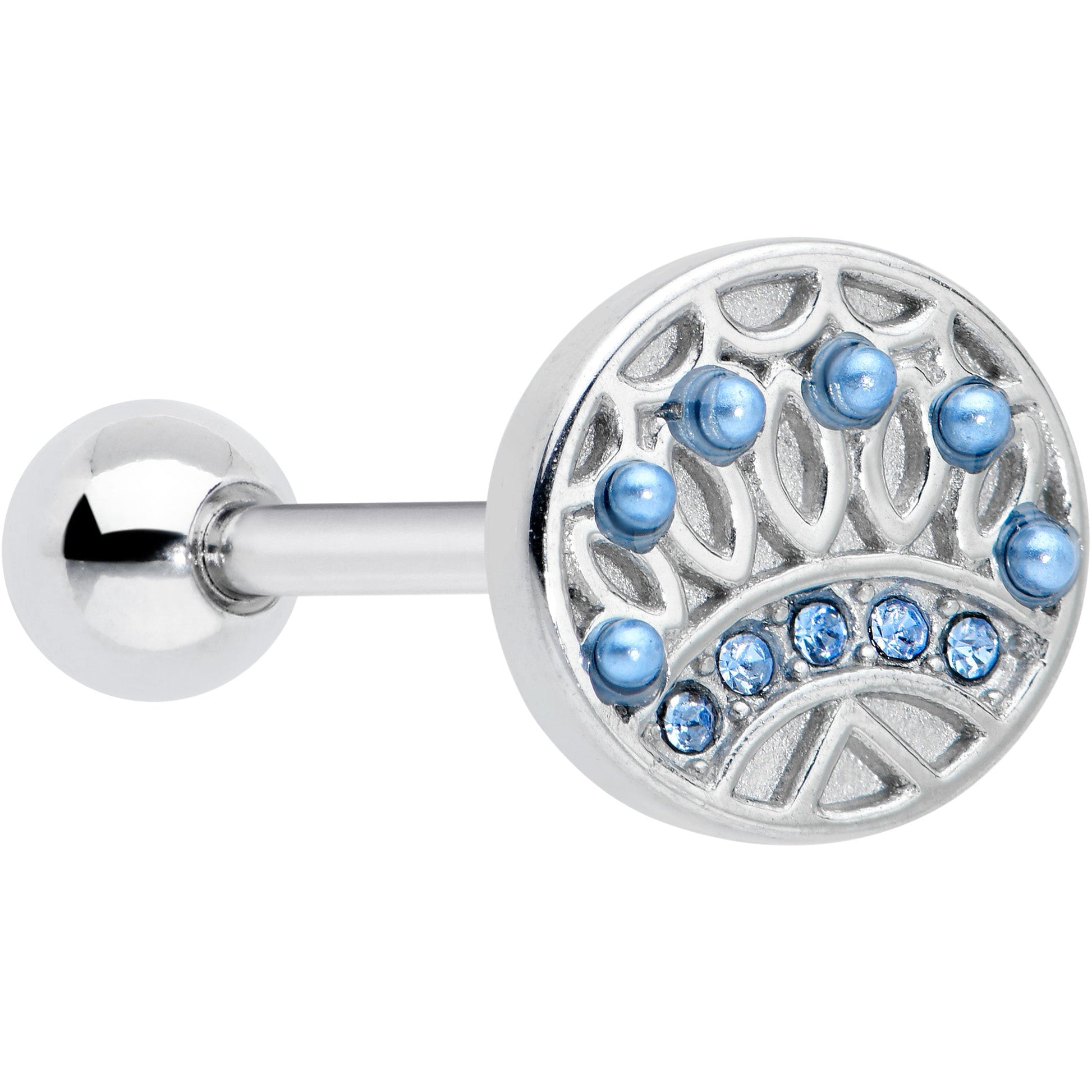 Even if you don't like math, you can't help but love this 14 gauge geometrically-themed tongue jewelry! It's made with a 5/8" durable 316L surgical grade stainless steel straight barbell with a 5mm bottom ball end. The top end features a circular charm with a geometric pattern of angles and lines. It's further embellished with tiny blue gems and blue pearlescent orbs for a cohesive appearance. You can toss your slide rule and compass, this geometry-themed tongue ring is working all the angles!Specifications