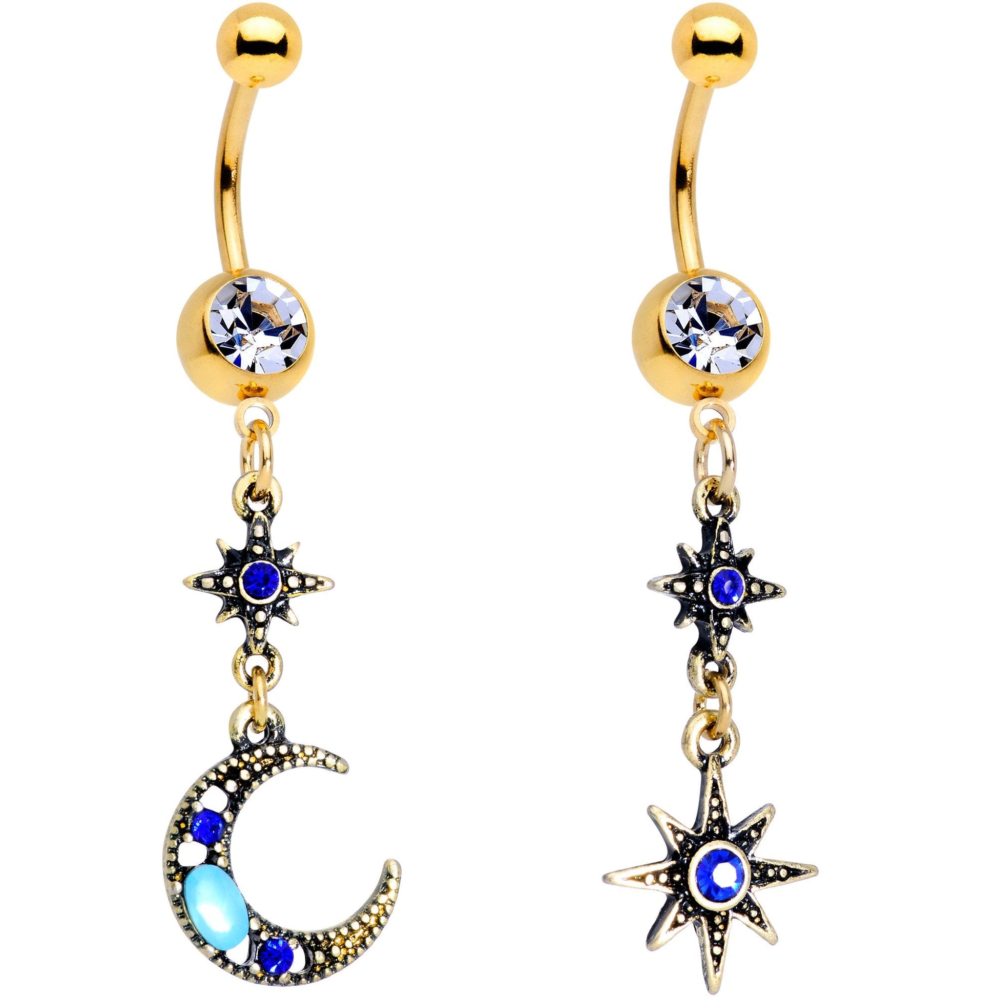 One for you, one for your best friend! Or you can keep them both, we won't tell. These breathtaking belly button piercings each feature a beautiful dangle charm; one crescent moon charm complete with two blue gems and an aqua gem, connected to a dangle four-pointed star, and one blue gem five-pointed star connected to a blue gem encrusted four-pointed star charm. Both 14 gauge navel rings are 3/8" in length and are made with a gold PVD over 316L surgical grade stainless steel curved barbell complete with a clear gem bottom ball for that extra bit of bling. Sold as a set of two.Specifications