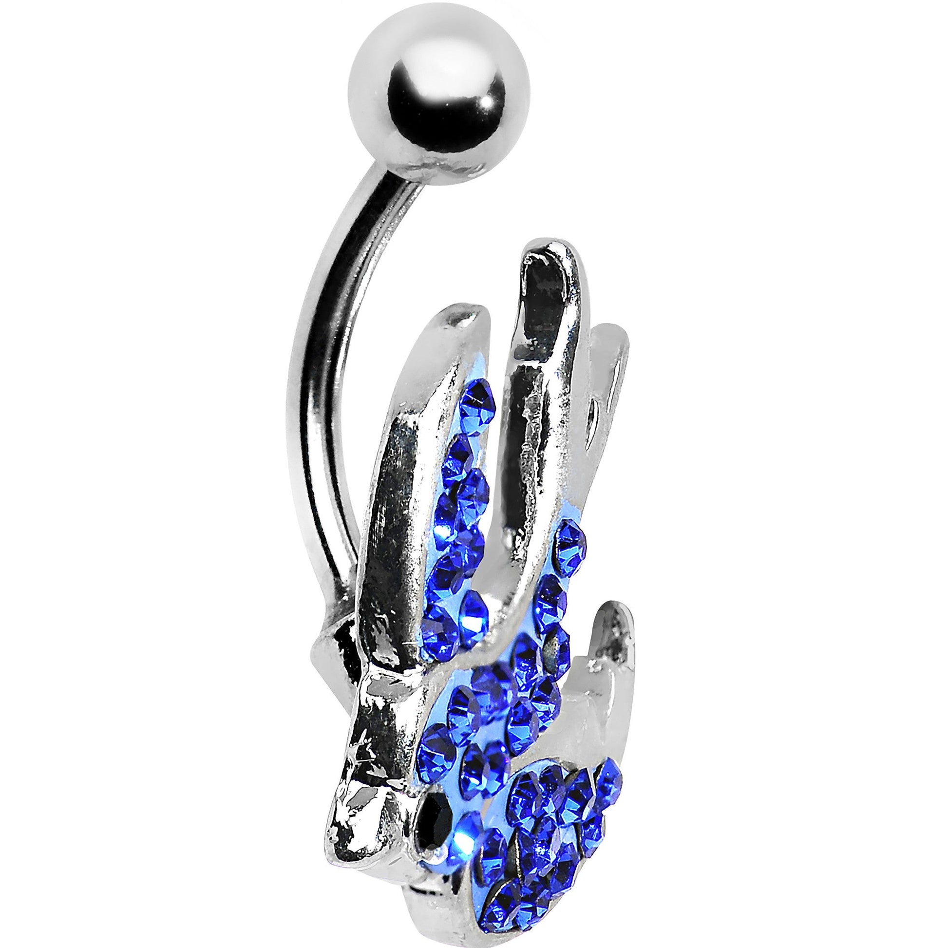 Soar above all the others with this super cute flying bird belly ring. Stainless steel curved barbell with mounted bird at bottom. Lovely soaring swallow covered in pretty blue gems. Cute bird body jewelry navel ring.