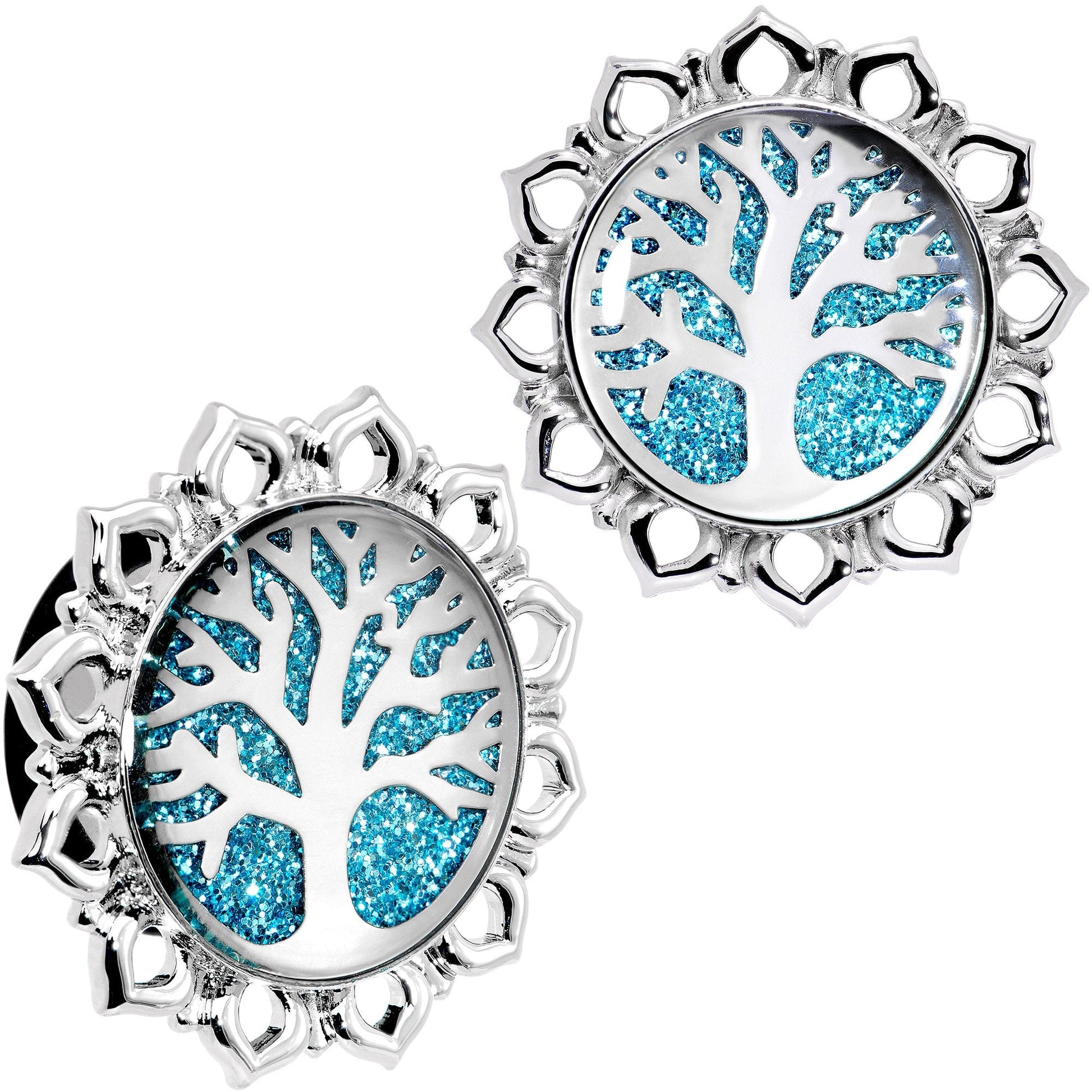 Blue Glitter Inlay Tree of Life Single Flare Plug Set 6mm to 20mm
