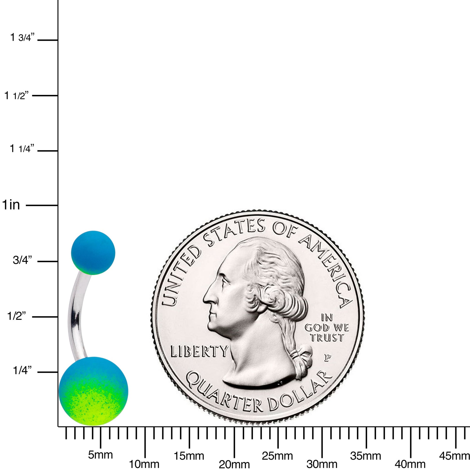 Some things need a softer touch....like this 14 gauge navel ring! It's made with a 7/16" durable 316L surgical grade stainless steel curved barbell. It has a 5mm top ball end and an 8mm bottom ball end. The ball ends feature a finish that's slightly soft to the touch, a perfect contrast to the light blue and bright green ombre colors! These bright, eye-catching colors are sure to stand out while their soft finish will ensure you will want to keep this belly jewelry in your navel piercing!