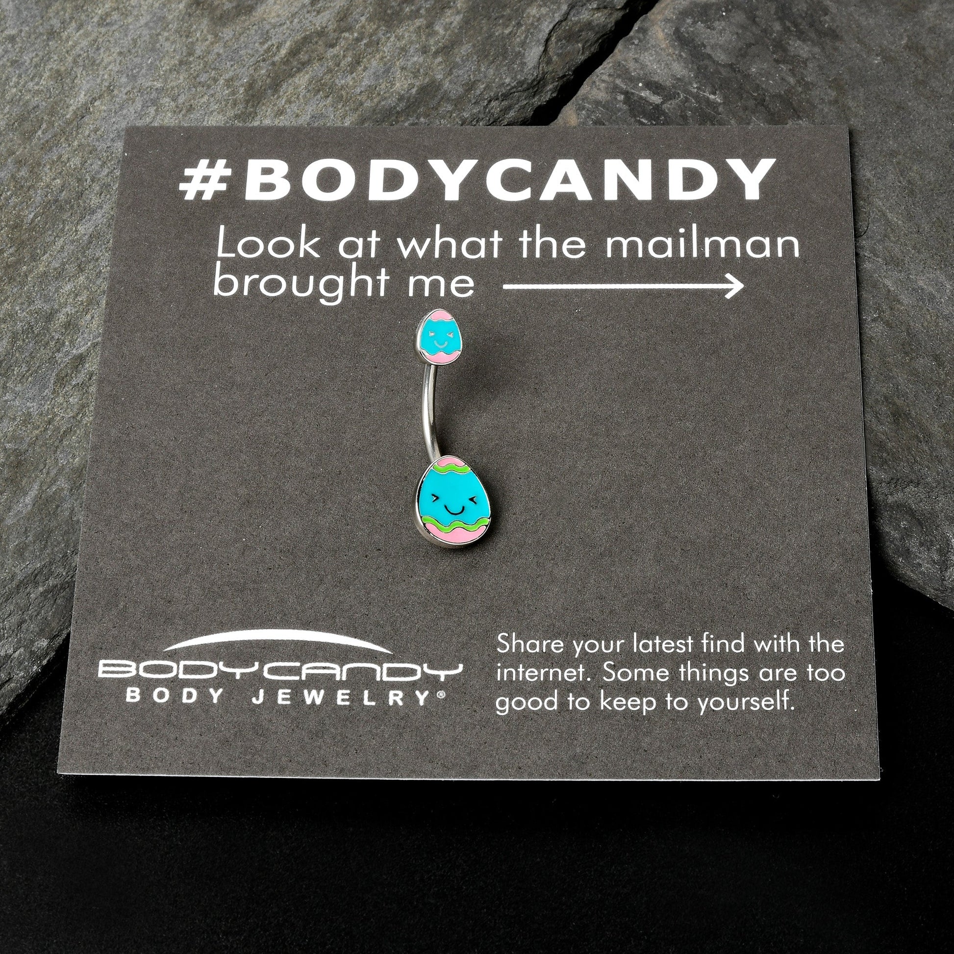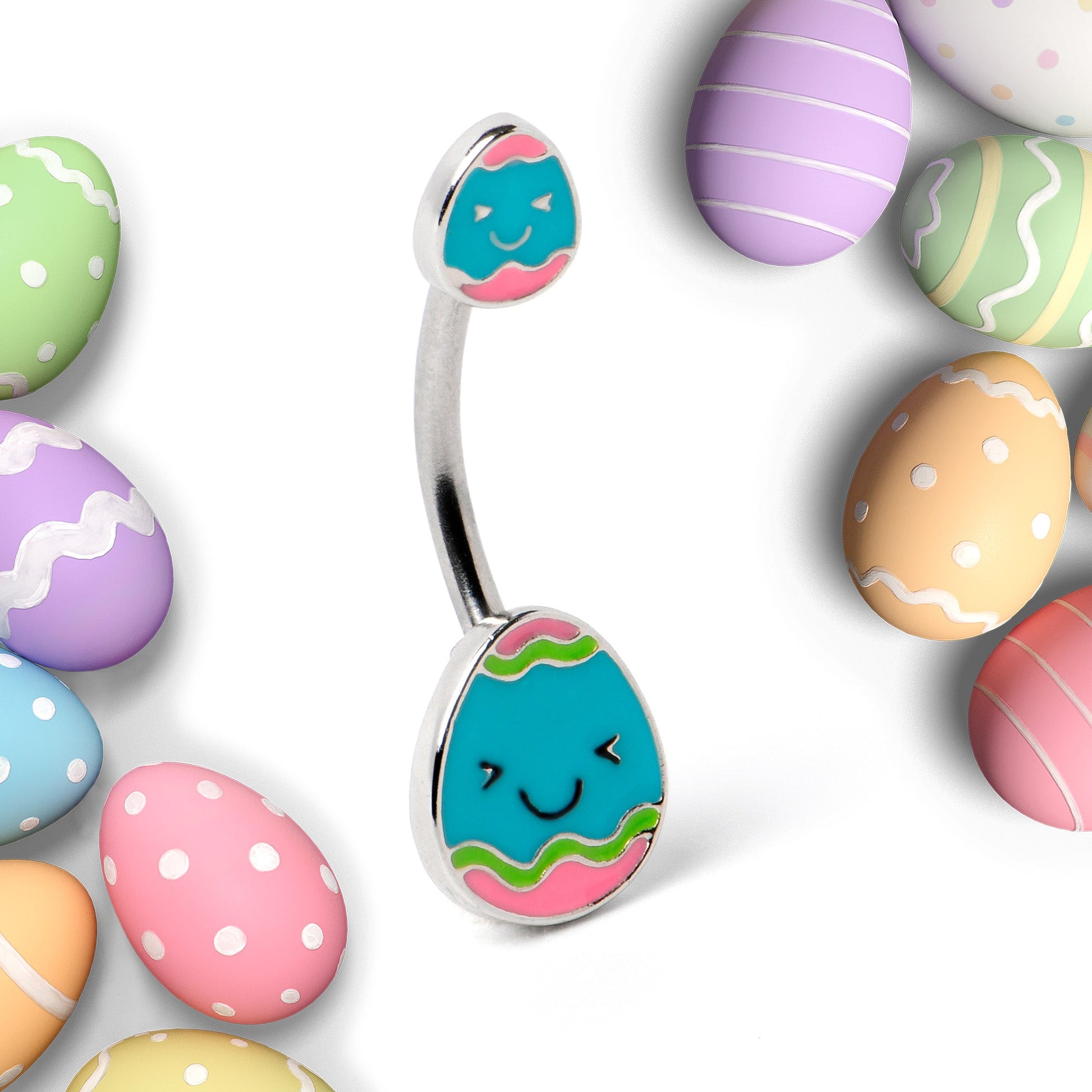 Get ready to hatch a new look for Easter with this 14 gauge navel ring! It's made with a 3/8" durable 316L surgical grade stainless steel curved barbell. Each of the ends features a blue Easter egg charm, with a cheerful smiling face. The eggs are further embellished with pink ends for a festive touch of color. You won't have to hunt for kawaii style body jewelry for Easter when you're rocking this Easter egg belly piercing ring!Specifications