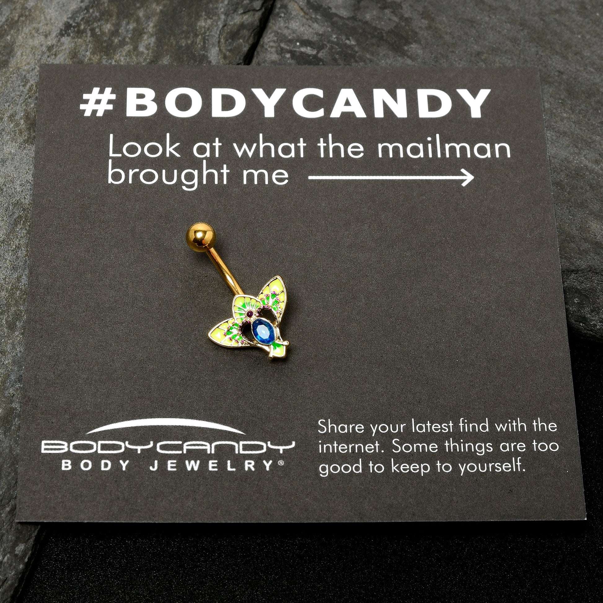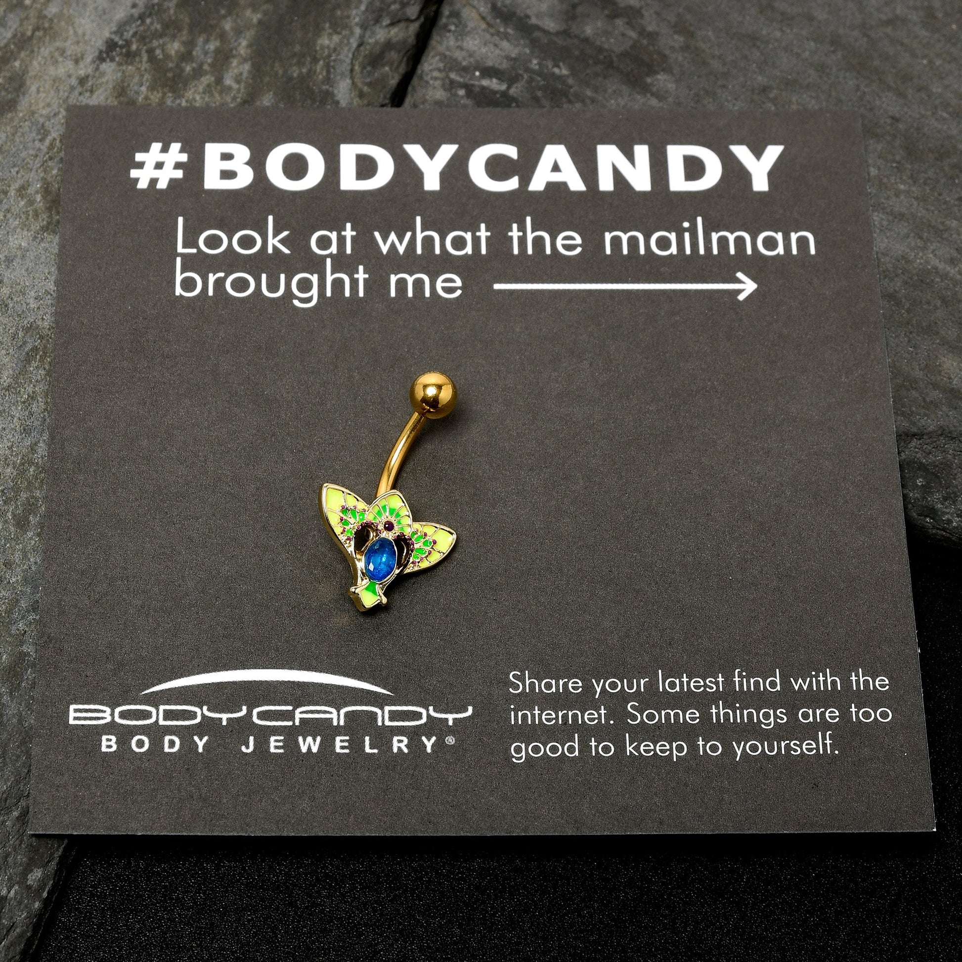 Take your look to the tropics with this 14 gauge navel ring! It's made with a 3/8" gold tone PVD over 316L surgical grade stainless steel curved barbell with a 5mm top ball end. The bottom end features a tropical charm of green and yellow leaves. It's set with a blue gem at the bottom, with a small purple gem above it for a truly luxurious appearance. You're sure to be a fan of this tropical fan belly piercing ring!Specifications