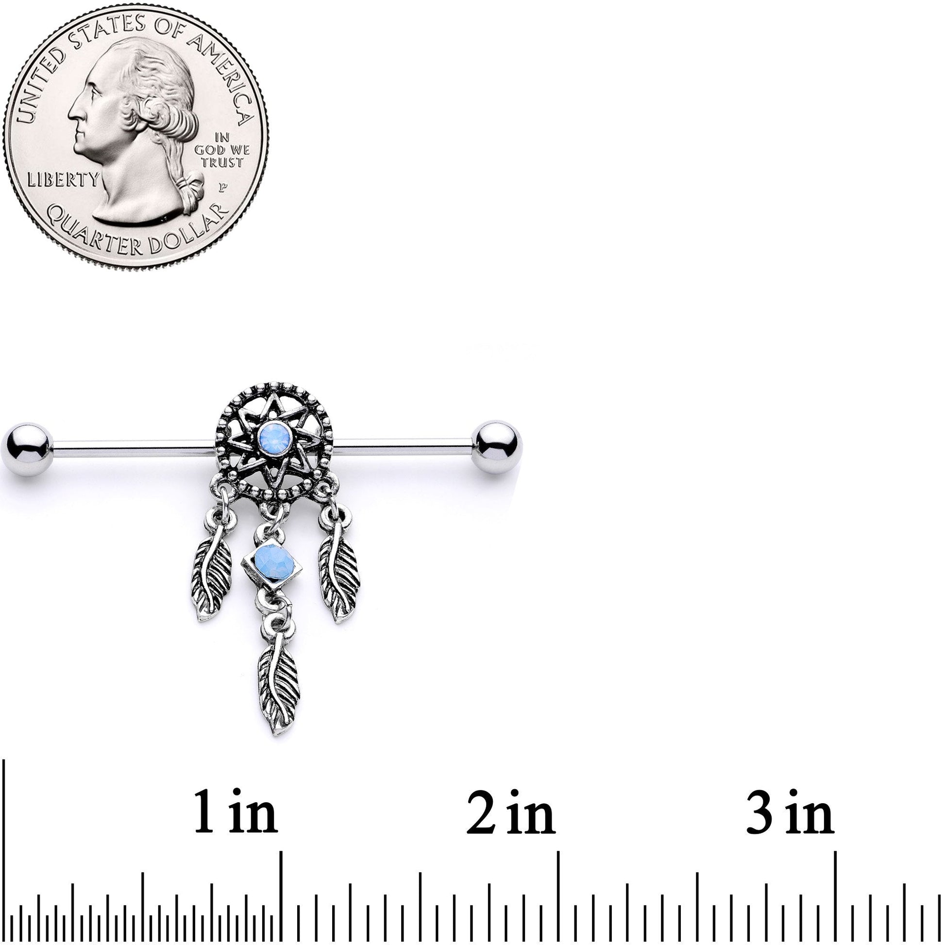If you love to dress up your double helix piercing with dreamy style then you'd better take a look at this 14 gauge industrial piercing! Made with a 1 1/2" durable 316L surgical grade stainless steel straight barbell, this industrial jewelry features a moveable dreamcatcher charm with feather dangles and blue synthetic opals for incredible style.Specifications