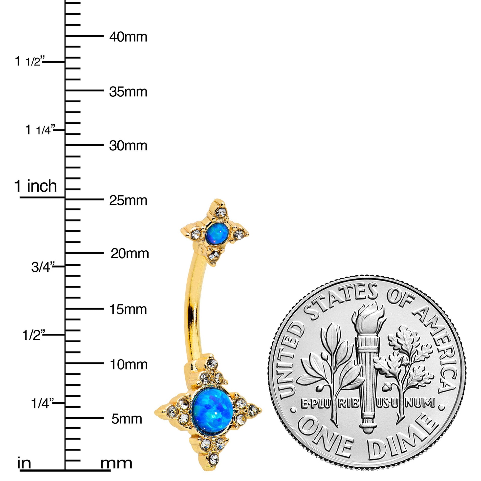 You'll feel like royalty when you're rocking this 14 gauge navel ring! It's made with a 3/8" gold tone PVD over 316L surgical grade stainless steel curved barbell. Each of the ends features an elegant rhombus charm, with clear gems set in each of the points. The rhombuses are set with blue synthetic opals at the center for a color contrast you can't take your eyes off of! Look as regal as you feel with this elegant rhombus belly piercing ring.Specifications