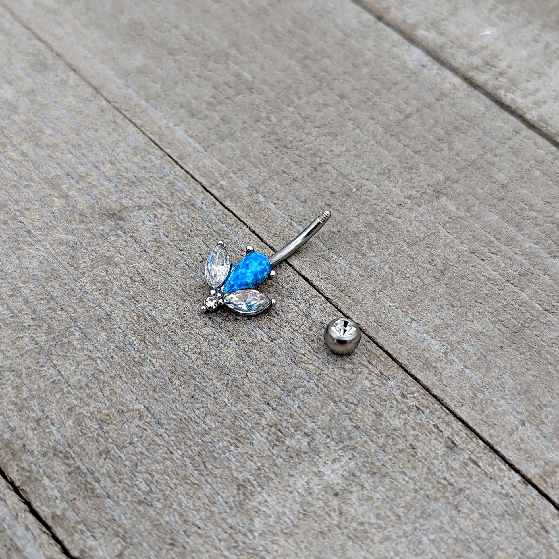 With lovely color and style, you can't help but love this 14 gauge navel ring! It's made with a 3/8" durable 316L surgical grade stainless steel curved barbell with a 5mm top ball end, which is set with a clear gem. The bottom end features a flower charm, the leaves set with small clear gems and the blossom composed of a blue synthetic opal. Keep it simple while keeping it stylish with this fabulous flower belly piercing jewelry!Specifications
