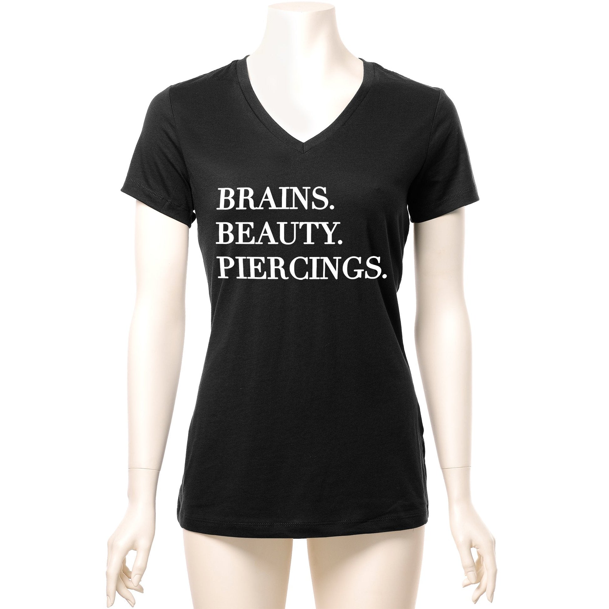 Brains Beauty & Piercings Tee V-Neck Shirt 100% Cotton