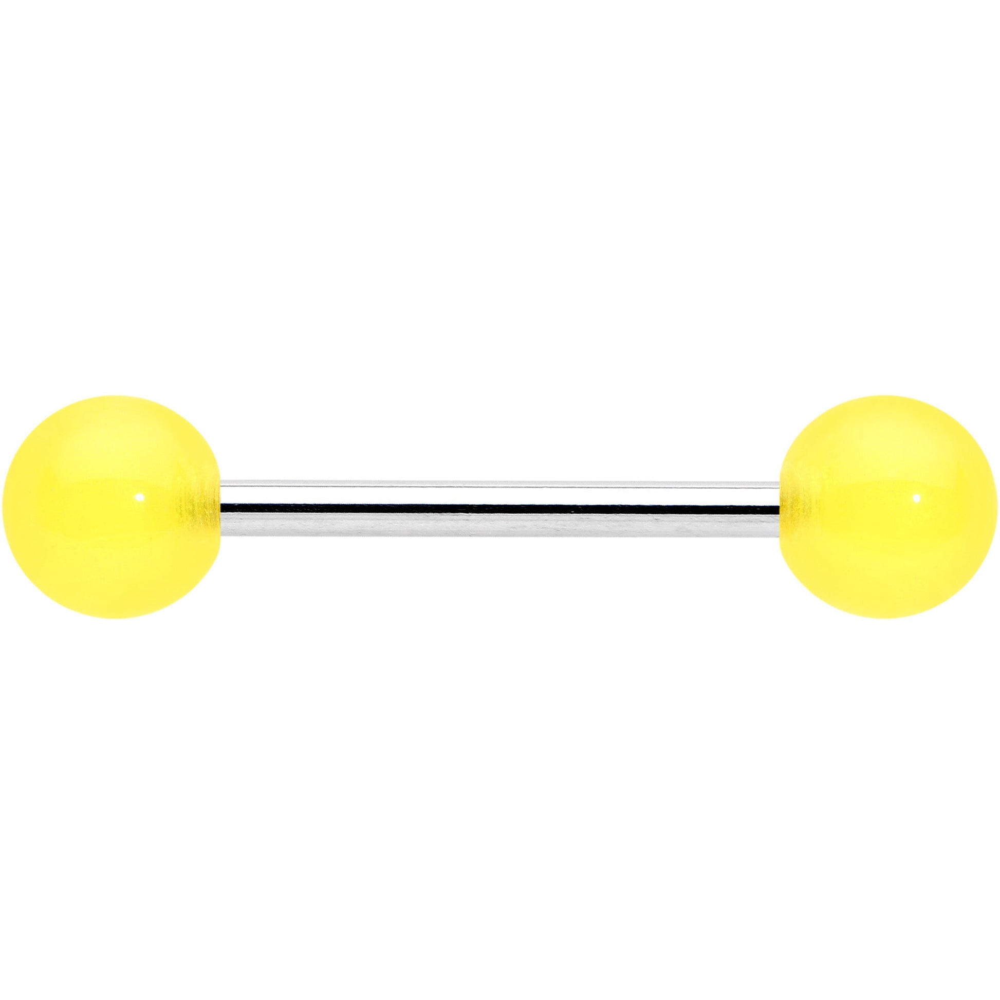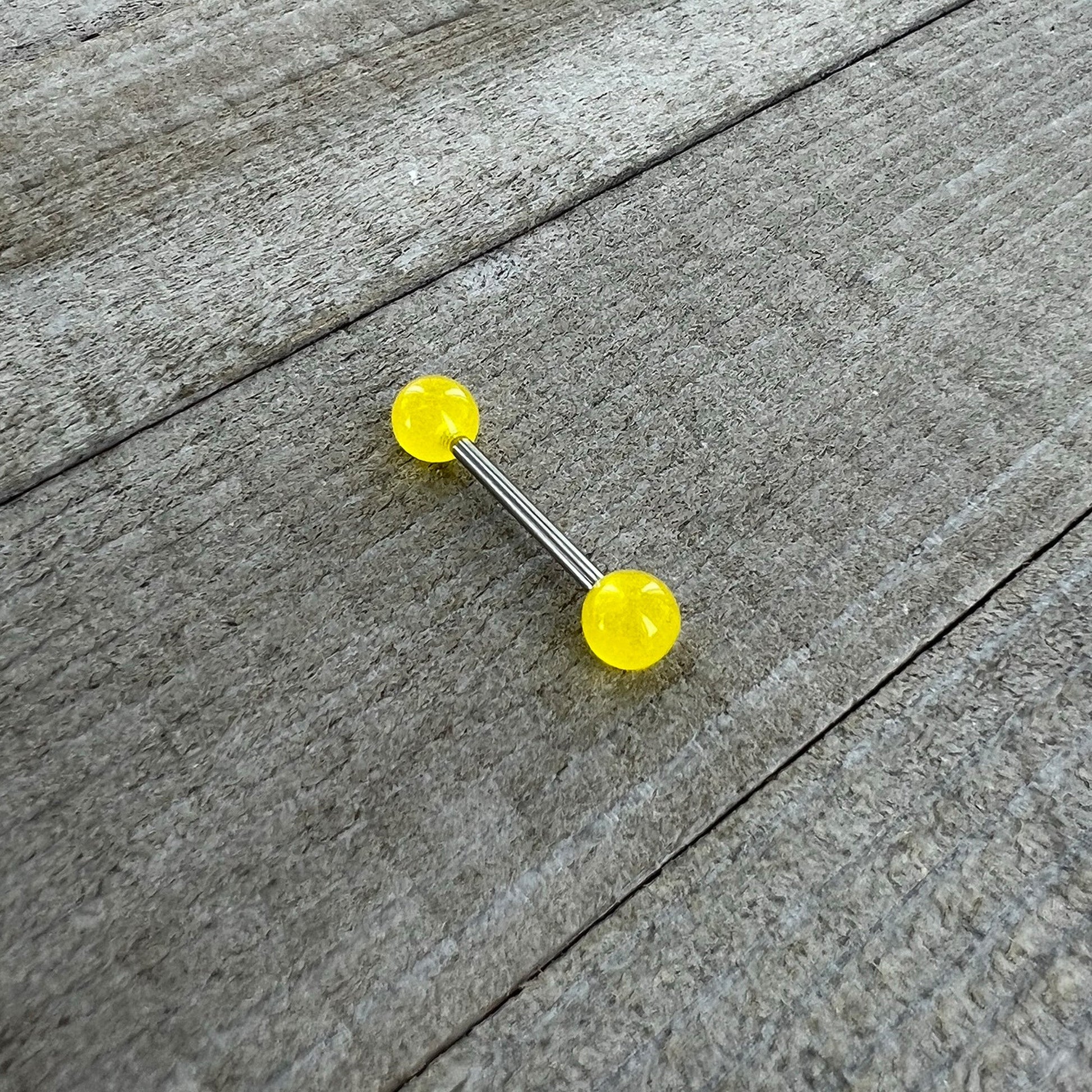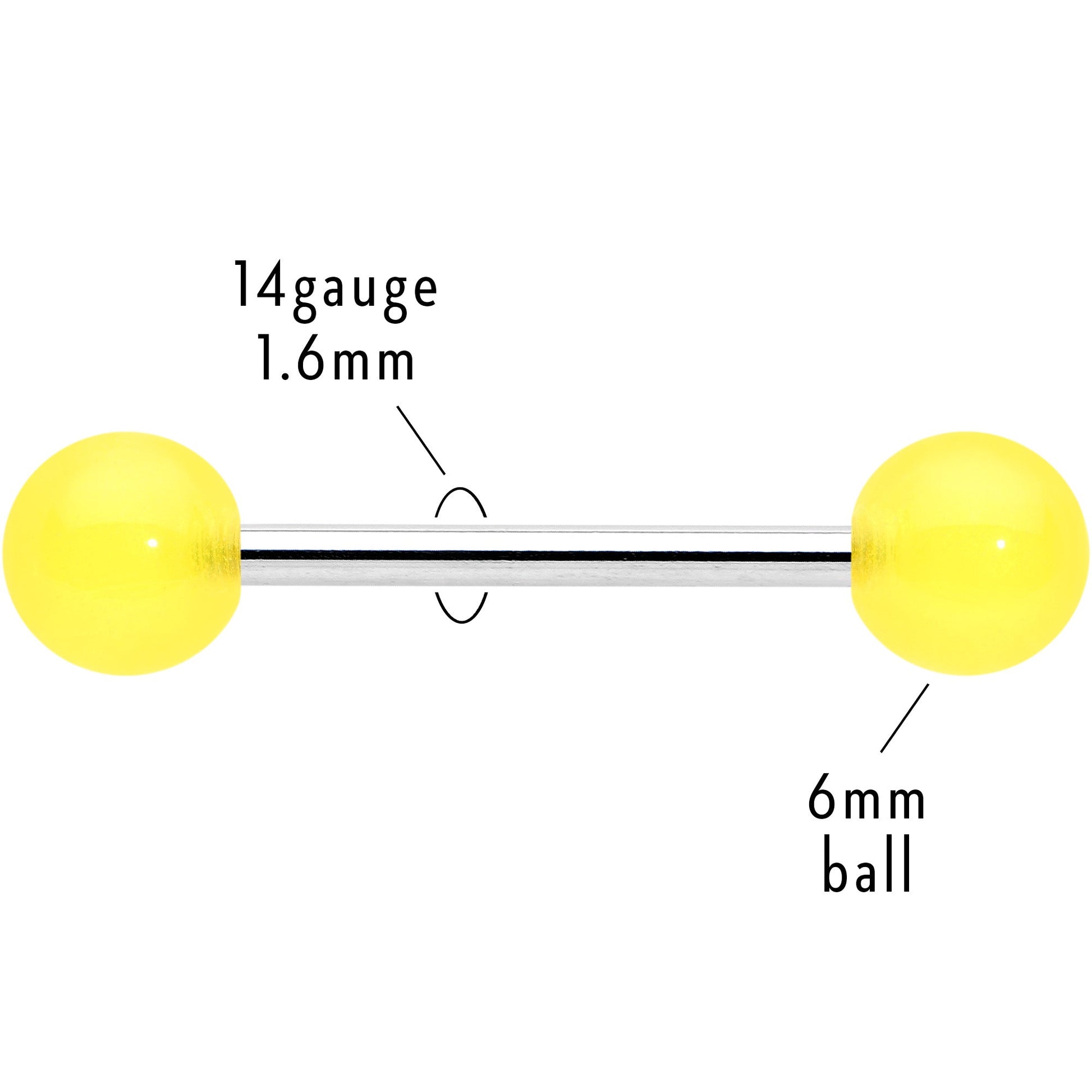 Add a ray of sun to your look with this cheerful 14 gauge tongue piercing ring! It's made with a 5/8" durable 316L surgical grade stainless steel straight barbell. It features 6mm acrylic ball ends in the brightest shade of yellow so that people will be hanging on your every word! Add some colorful cheer to your look with this sunny and stylish tongue piercing jewelry!Specifications
