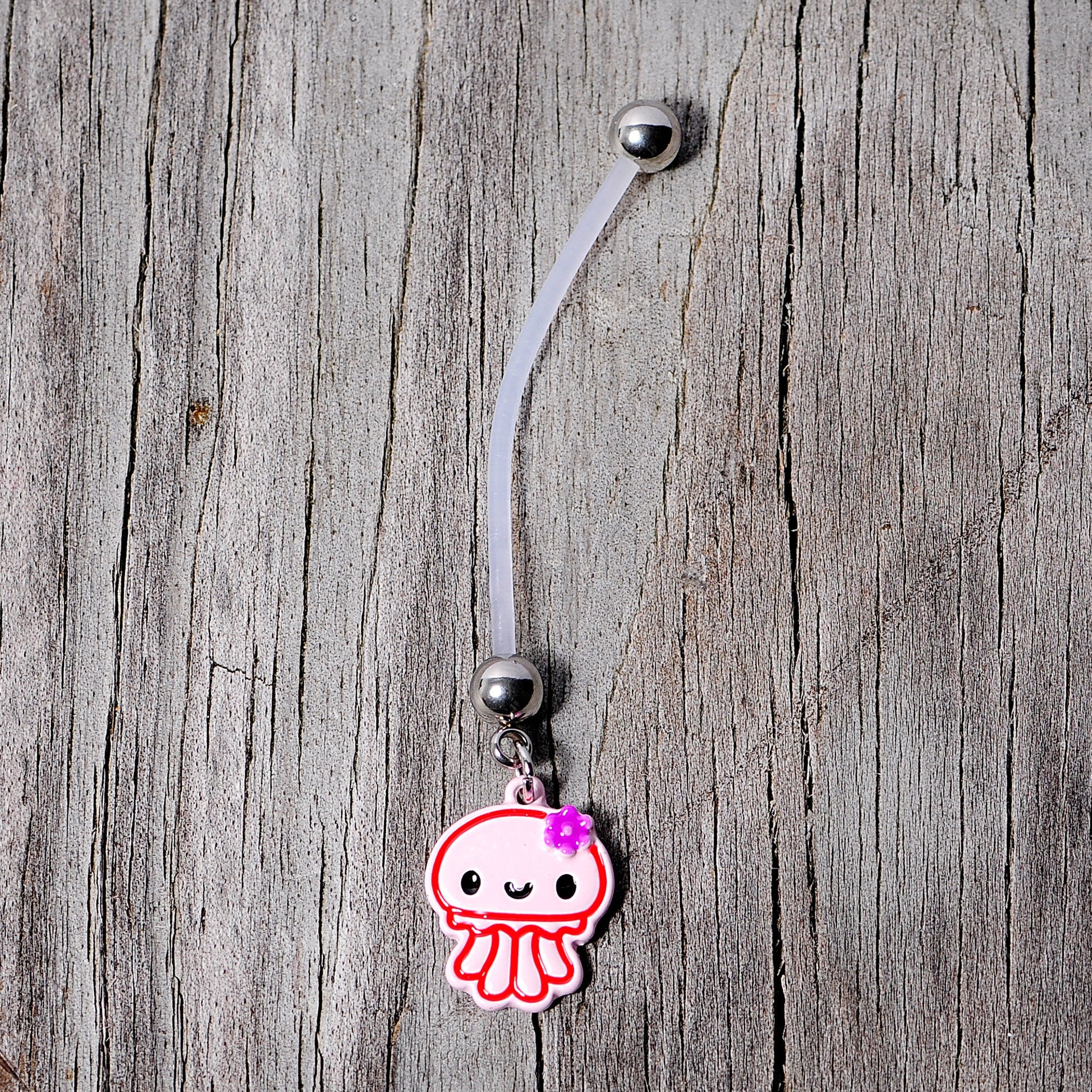 If you don't want to give up your navel piercing now that you're pregnant then you will love this 14 gauge belly button ring that is made for mommy's tummy. Made with a 1 7/16" clear Bioflex straight barbell, this navel jewelry features plain ball ends and a baby pink squid dangle charm that signifies the bun in your oven! The flexible Bioflex barbell is self-threading and can be trimmed to a perfect fit. Simply cut where needed and reattach the ball end for a fit that's custom to your changing body.Specifications