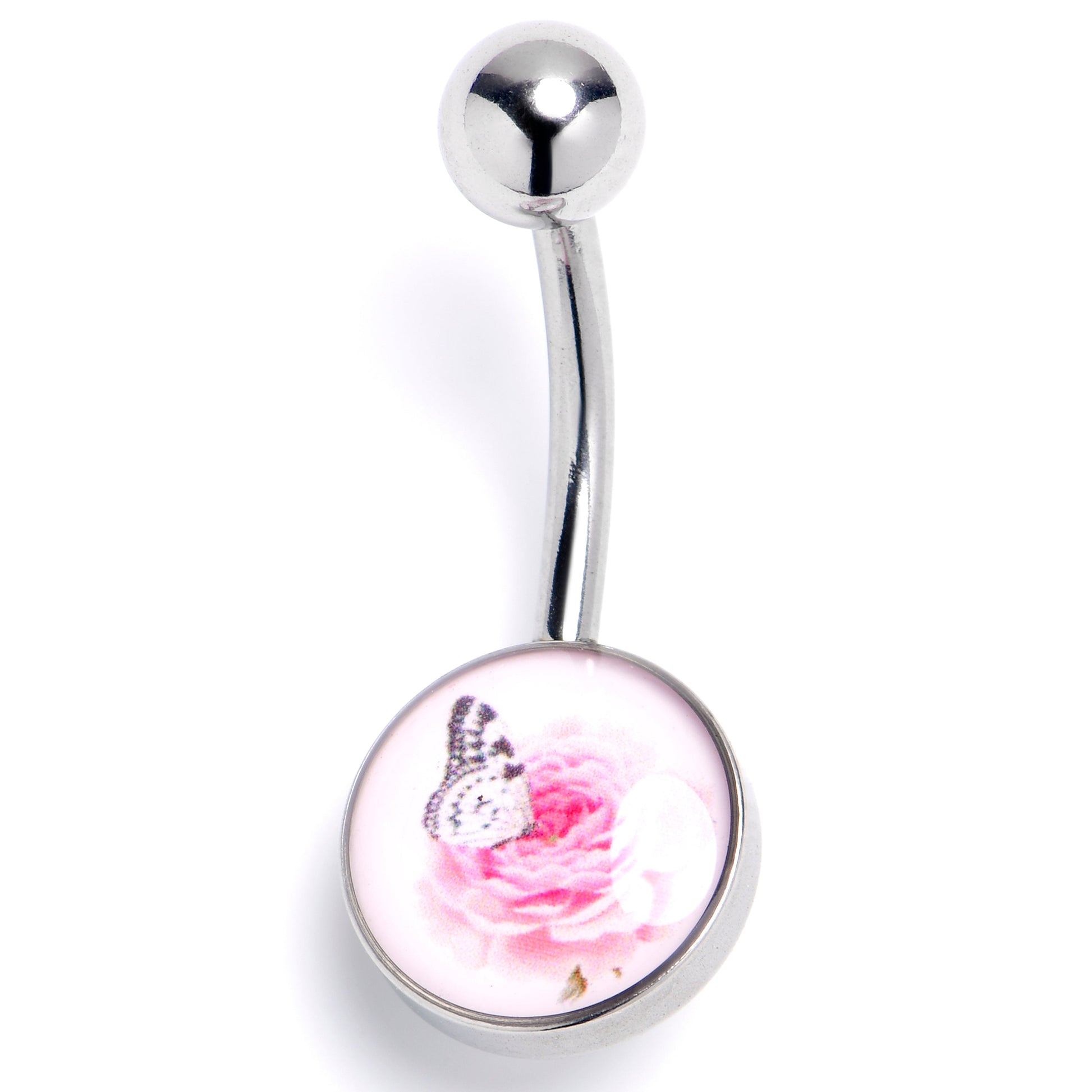 Enhance your look with this elegant 14 gauge navel ring. It is made with a 3/8 inch 316L surgical grade stainless steel curved barbell with a 5mm top ball end. The bottom end features a delightful fusion of elegance and charm with a captivating butterfly design in a delicate pink rose hue, symbolizing grace and transformation. Transform into style with this beautiful butterfly belly piercing jewelry.Specifications