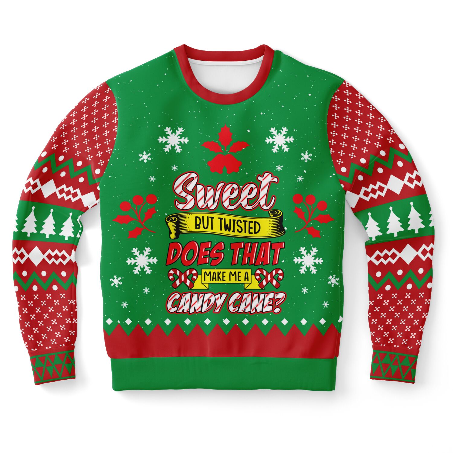 This playful Christmas sweater pairs sugar-coated sass with a cheeky candy cane pun that’s perfect for party season.
