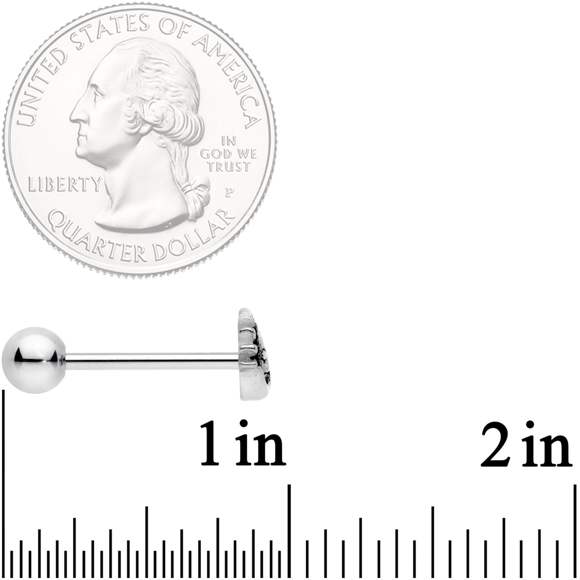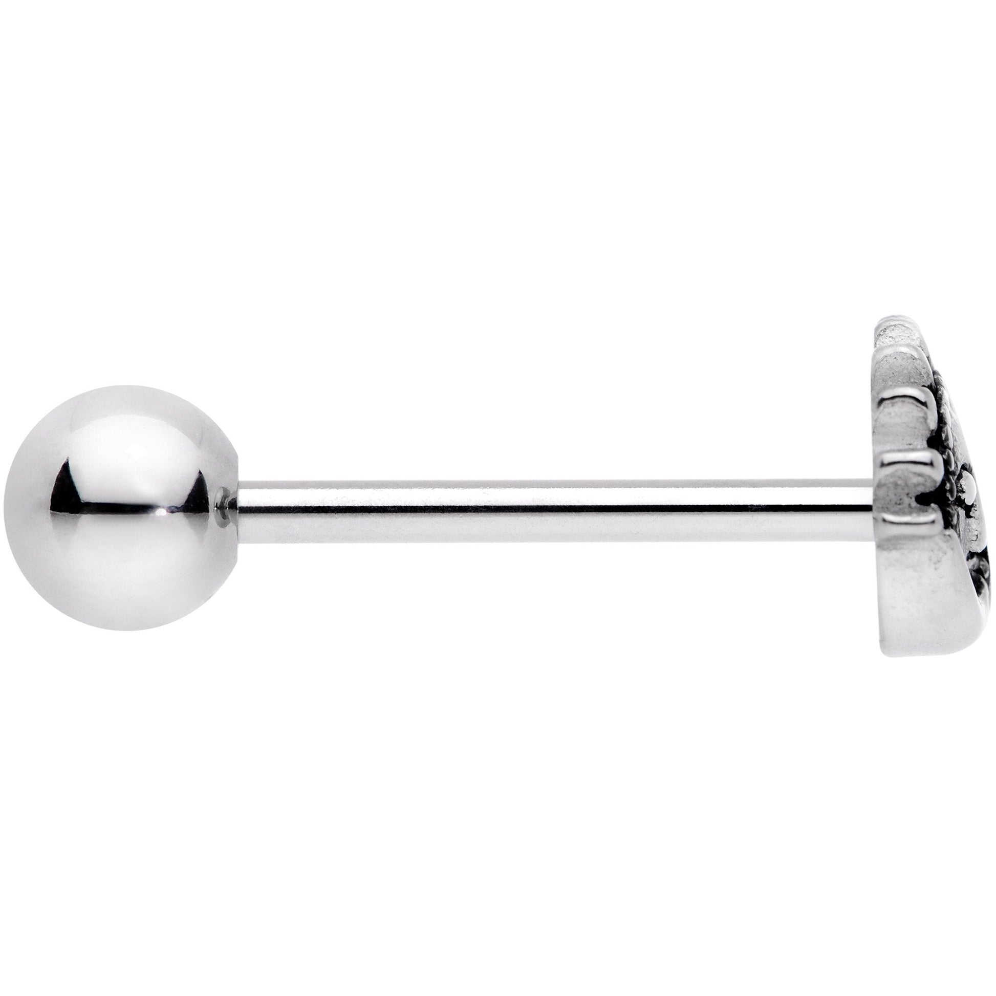 The sun and the moon have come together for a cuddle on this 14 gauge tongue barbell! The tongue piercing is made with a 5/8" durable 316L surgical grade stainless steel straight barbell and has a 5mm bottom ball end. The other end features a charm of the sun and the moon ends holding one another in a lover's embrace. You'll be just as happy as these two are when you have this barbell in your tongue piercing!Specifications