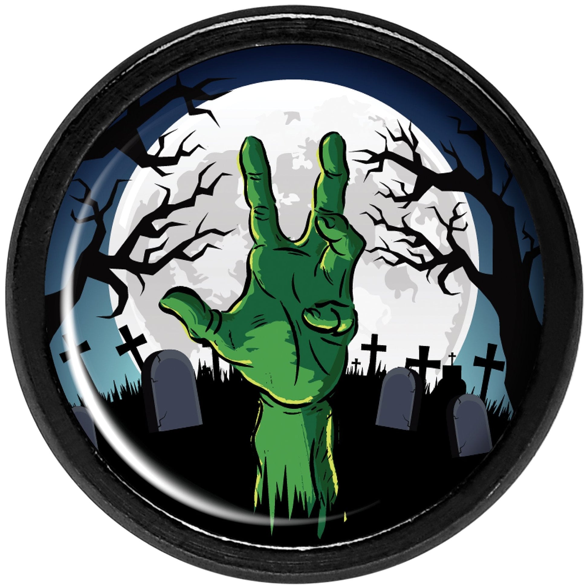 If you love scary scenes and Halloween things then this pair of ear plugs is right for you! Made with black anodized titanium over 316L surgical grade stainless steel, these 8mm ear gauges feature cemetery with green zombie hand logo inlays.