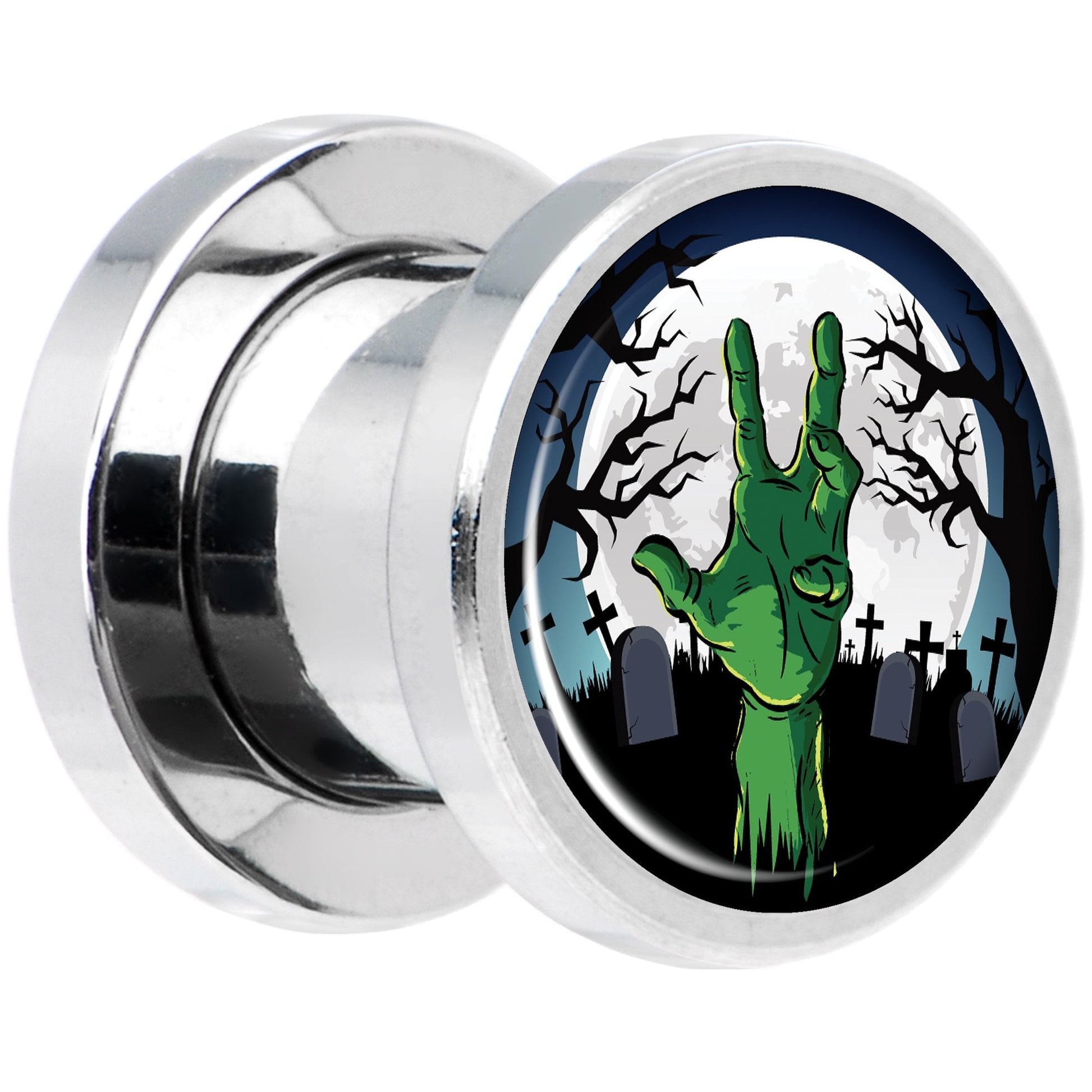 If you love scary scenes and Halloween things then this pair of ear plugs is right for you! Made with durable 316L surgical grade stainless steel, these 8mm ear gauges feature cemetery with green zombie hand logo inlays.
