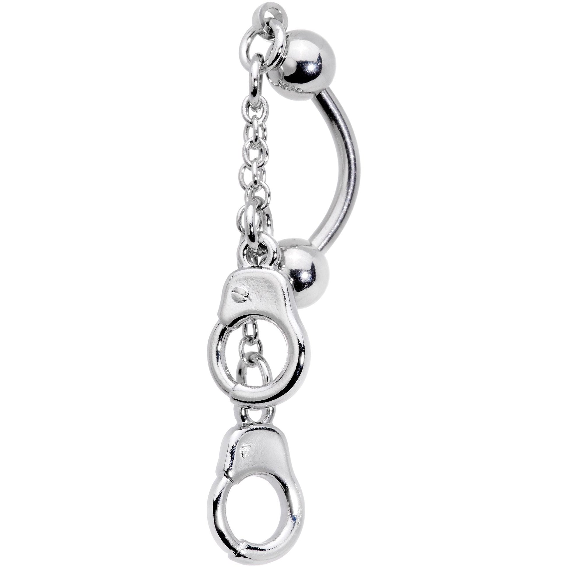Show off your wild side with this reversible dangle belly button ring. Two nonworking handcuff charms hang from chain links on this 14 gauge belly button piercing, which can be worn as a standard navel piercing or as a top down reverse style. The cuff charms dangle from a 3/8" in length 316L surgical grade stainless steel curved barbell.
